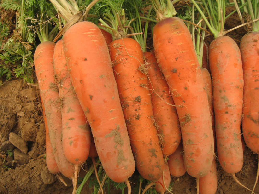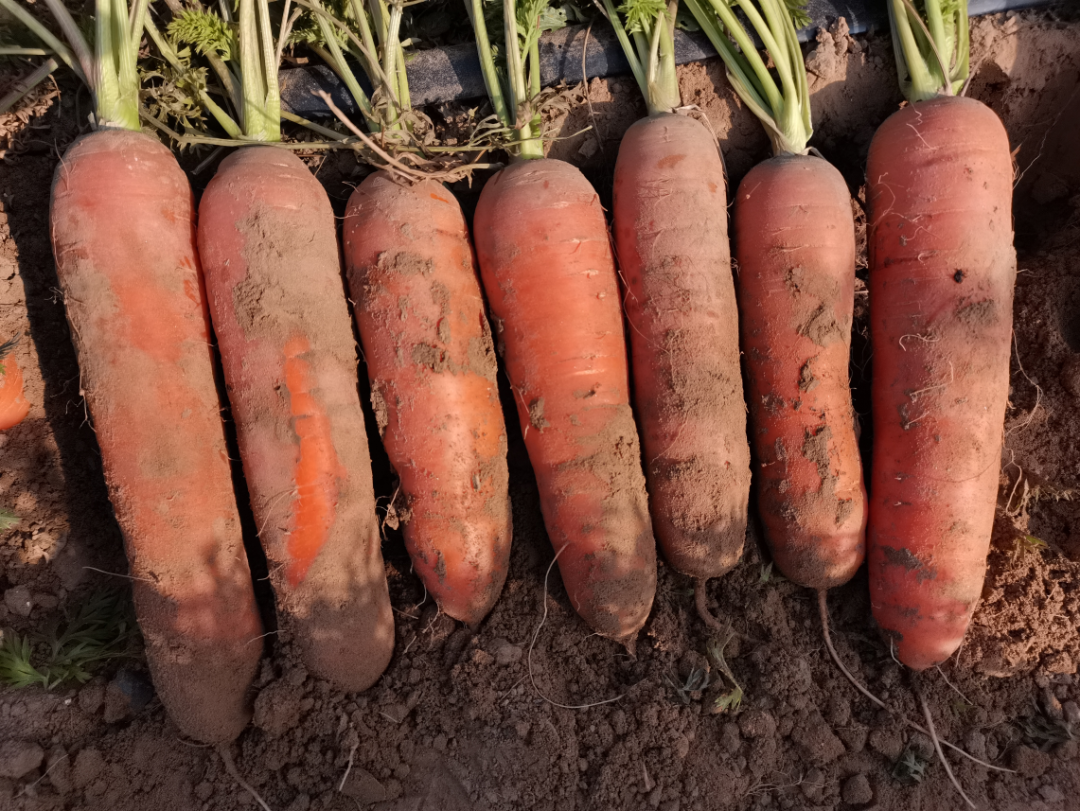 郑州市农业科技研究院培育胡萝卜新品种,生育期(播种至成熟)130天。生长势强。植株较直立,叶绿色,复叶大,叶柄绿色。肉质根圆柱形,根皮桔红色,肉桔红色,心柱红色,心柱较细,根长21.8cm,根粗4.5cm。商品根率为98.2%,单根重为356g,亩产为5454.26kg。抗病。