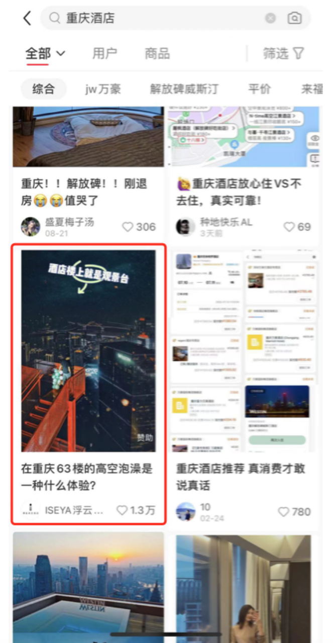 ① 素材内容区别于传统酒店取景,增加达人打卡,以出片效果极佳的内外环境吸引更多高消费年轻用户入住。