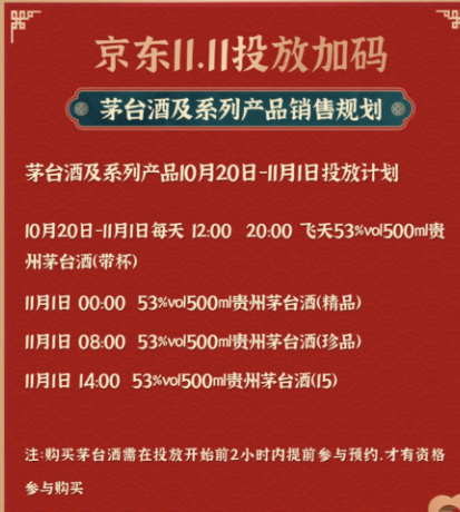 京东率先推出了贵州茅台酒及系列产品双11活动,10月20日-11月1日两场,12点和20点!