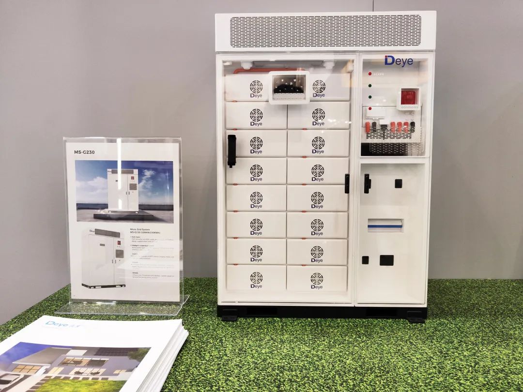 目前,德业在储能一体化类产品上不断创新,持续突破。现场展出了2023年新推出的工商业微电网一体化产品MS-G230(100kW/230kWh)系列。该系列产品占地仅1.7㎡,内置EMS转化器和BMS,环保节能化设计,支持黑启动功能。智能温控设计,电池运行温度可低至38℃。同时拥有强大的扩展功能,内置气溶胶灭火设备,更安全可靠。