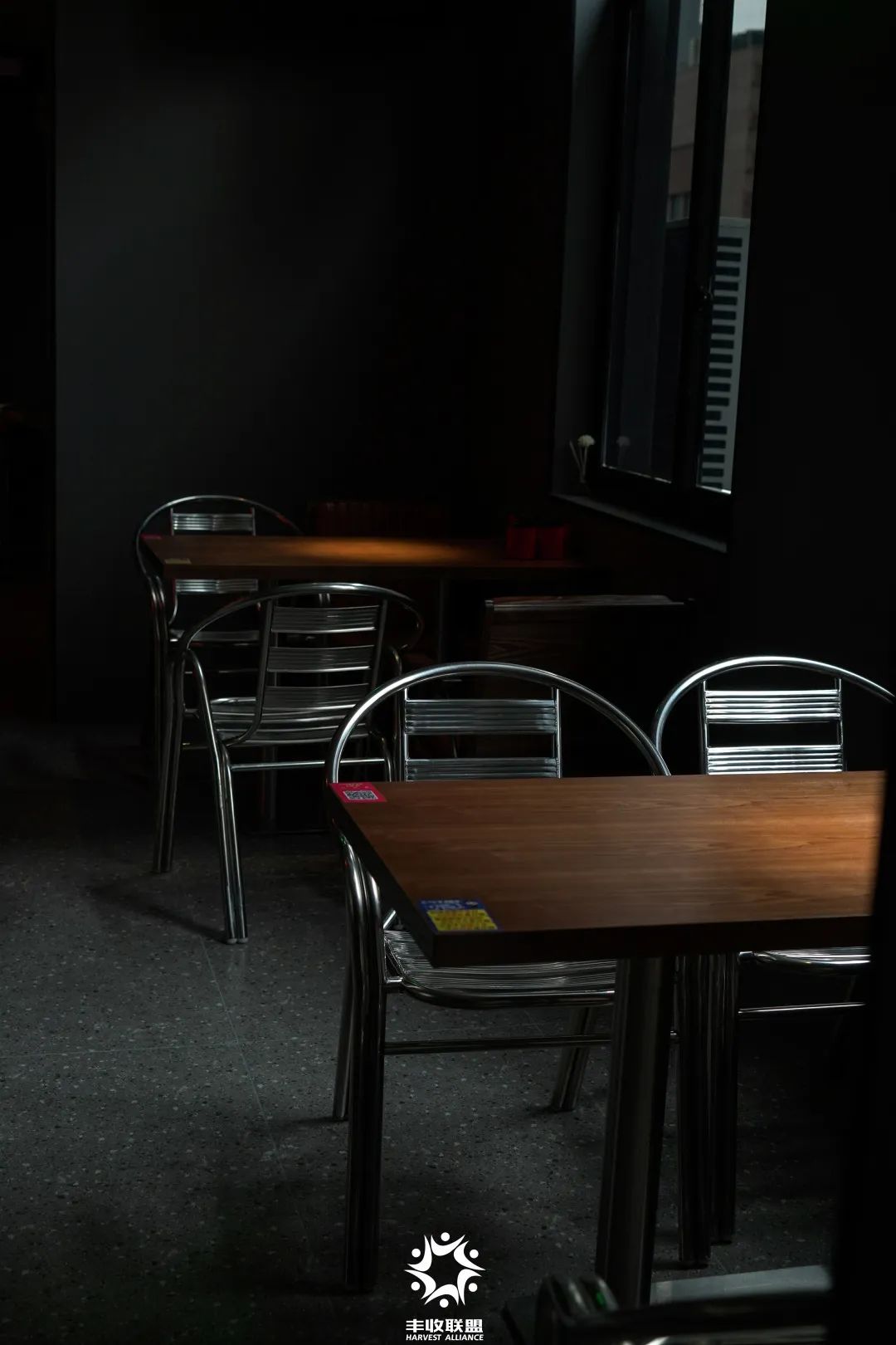 掀帘而入,黑暗的灯光让人分不清昼夜,精致的墙体、一排排整齐的餐桌、舒适的沙发座椅、张贴于各处的复古海报,都让『十米』呈现出一种美式随性的氛围感。
