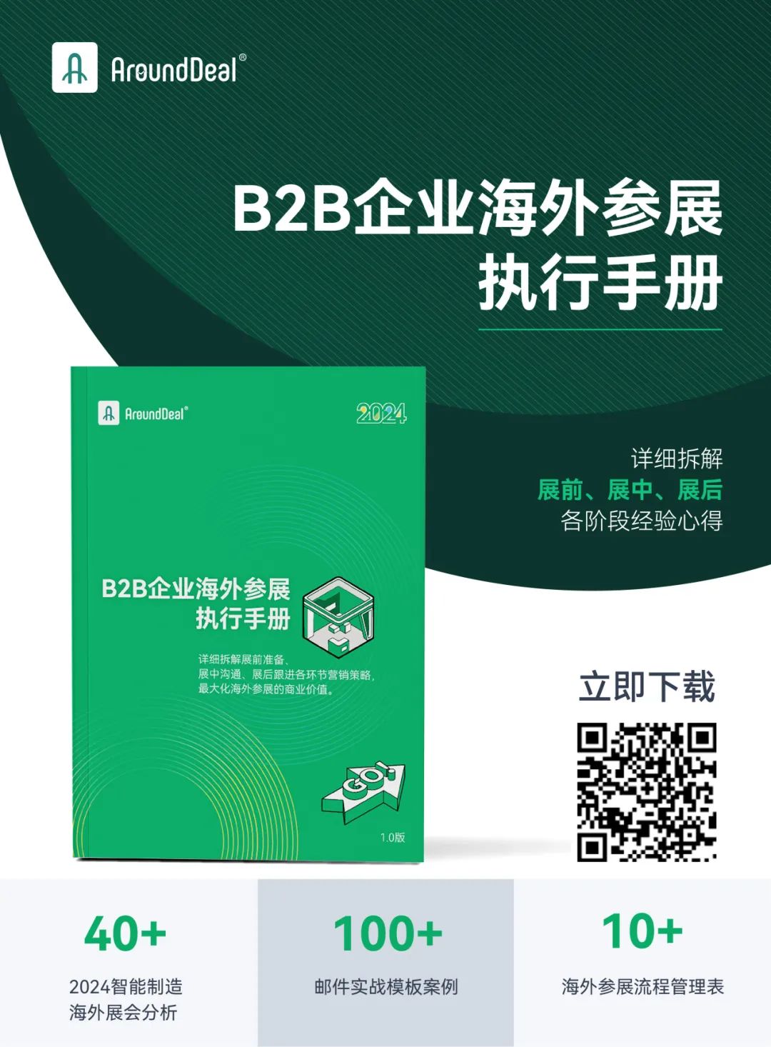 为助力更多B2B出海企业携手应对出海参展新常态,AroundDeal正式推出《2024B2B企业海外参展执行手册》,详细拆解展前准备、展中沟通、展后跟进的各环节营销策略,最大化海外参展的商业价值,扫描下方二维码,或点击“阅读原文”,即可免费下载。