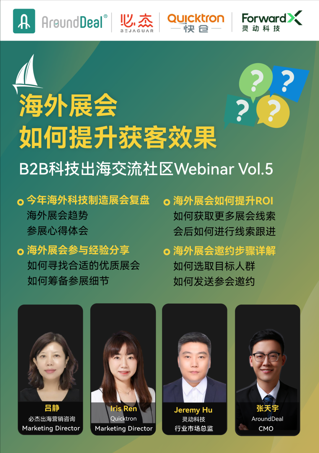 AroundDeal以此为出发点,于2023年10月20日主办了出海Webinar:B2B海外展会如何提升获客效果,与必杰、快仓及灵动科技的市场总监们共同探索海外参展的获客之路。