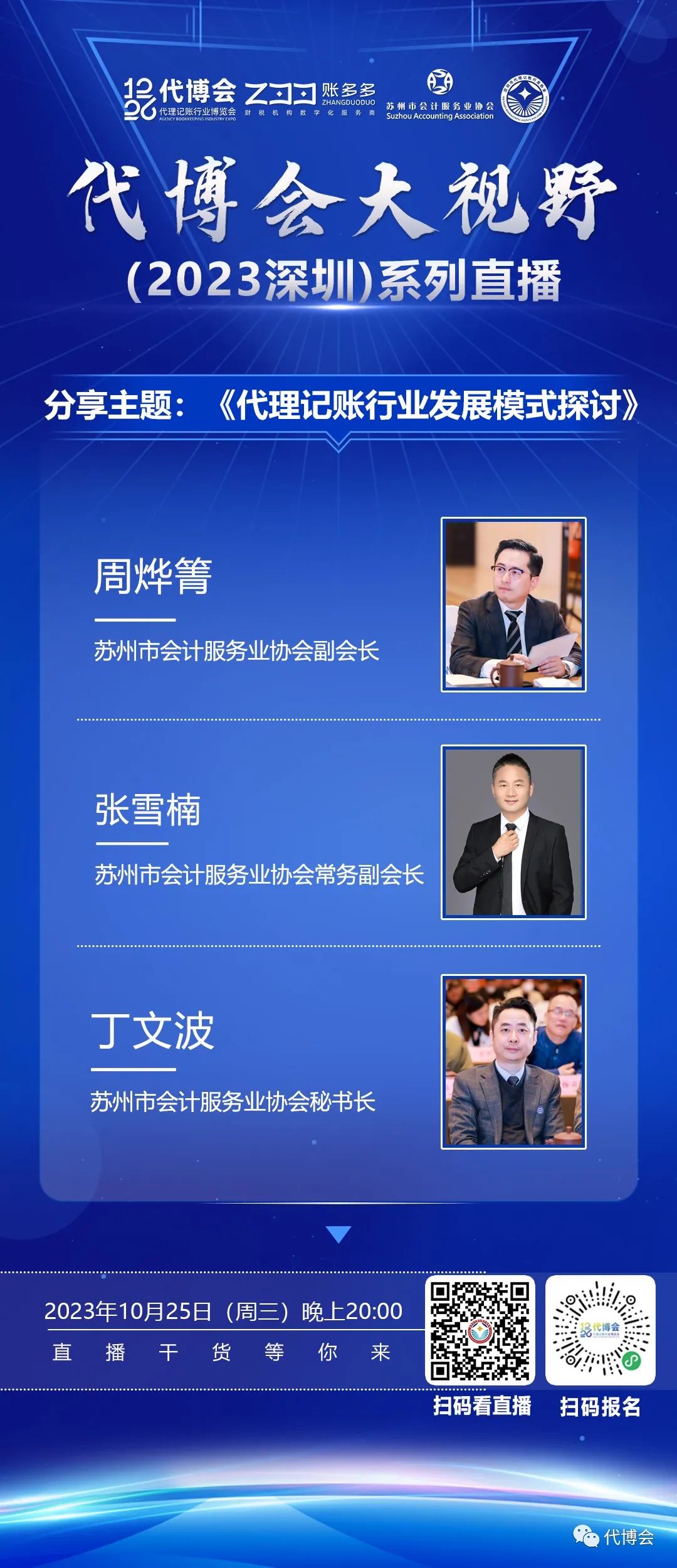 2023年10月25日晚上8点,深圳市代理记账行业协会首创“云访谈”系列公益直播第62期准时开播,本期为“1226代博会大视野”系列直播的第九期,携手苏州市会计服务业协会共同举办,苏州市会计服务业协会秘书长、苏州营盛财务服务有限公司董事长丁文波担任主持人,特邀嘉宾为苏州市会计服务业协会副会长、苏州业勤会计事务代理有限公司董事长周烨箐,苏州市会计服务业协会常务副会长、苏州和融财税服务外包有限公司董事长张雪楠,共同探讨分享《代理记账行业发展模式探讨》。本期【深圳市代理记账行业协会】视频号近2000人观看,点赞近两万,感谢同行朋友的大力支持和收看。