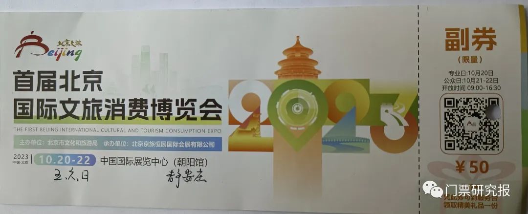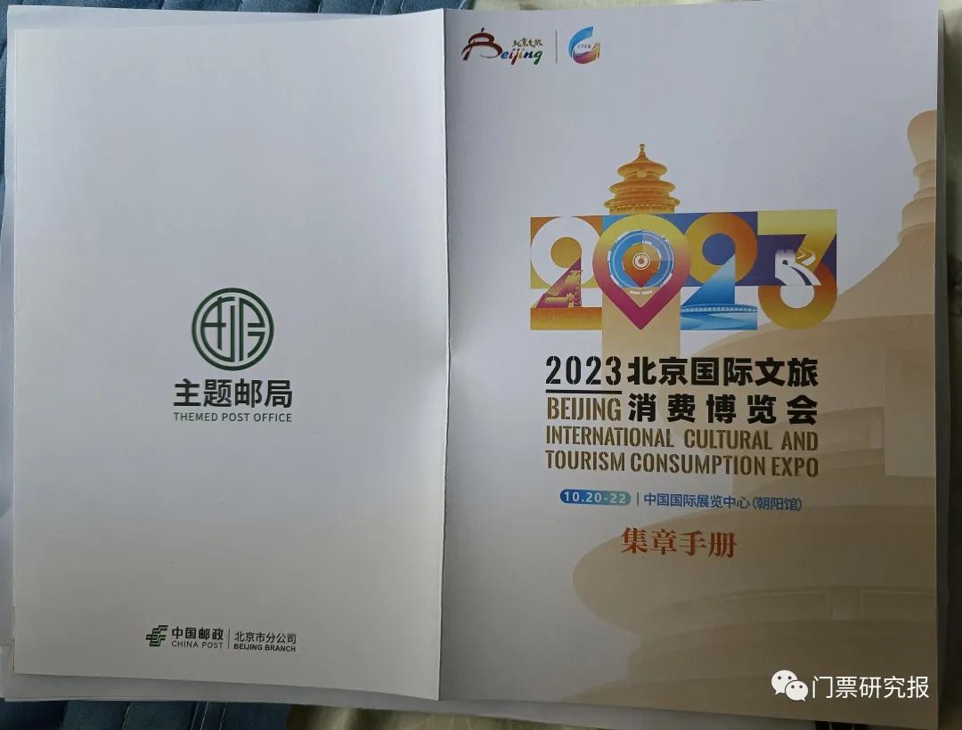 有副券的门票是参观服贸会赠送的,不过门口也可扫码领票进入参观。盖章依然是热点,大小展台摆放不少,有需扫码消费才可以盖,也有免费盖的,但章的设计大小不一,内容 样式 美观程度也参差不齐。服务台还提供有简易的“2023北京国际文旅消费博览会集章手册”。