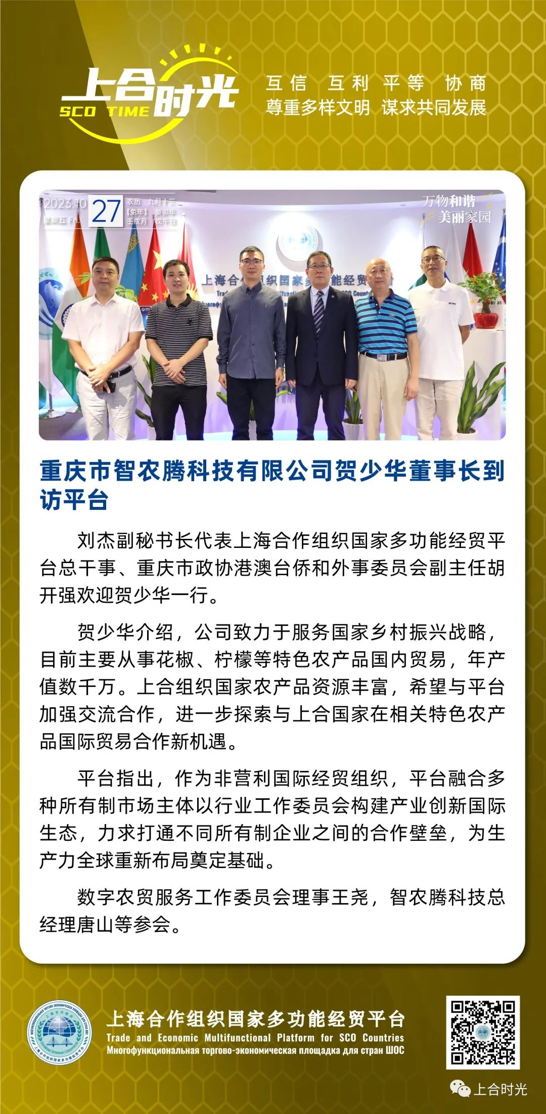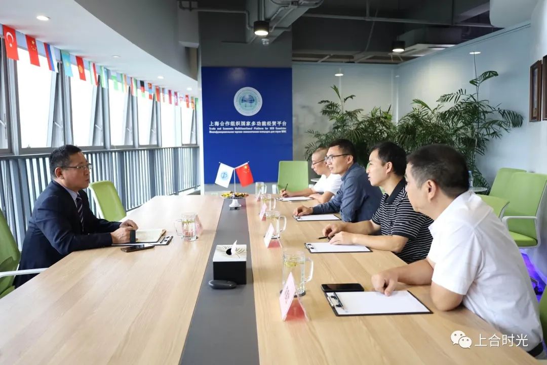 刘杰副秘书长代表上海合作组织国家多功能经贸平台总干事、重庆市政协港澳台侨和外事委员会副主任胡开强欢迎贺少华一行。
