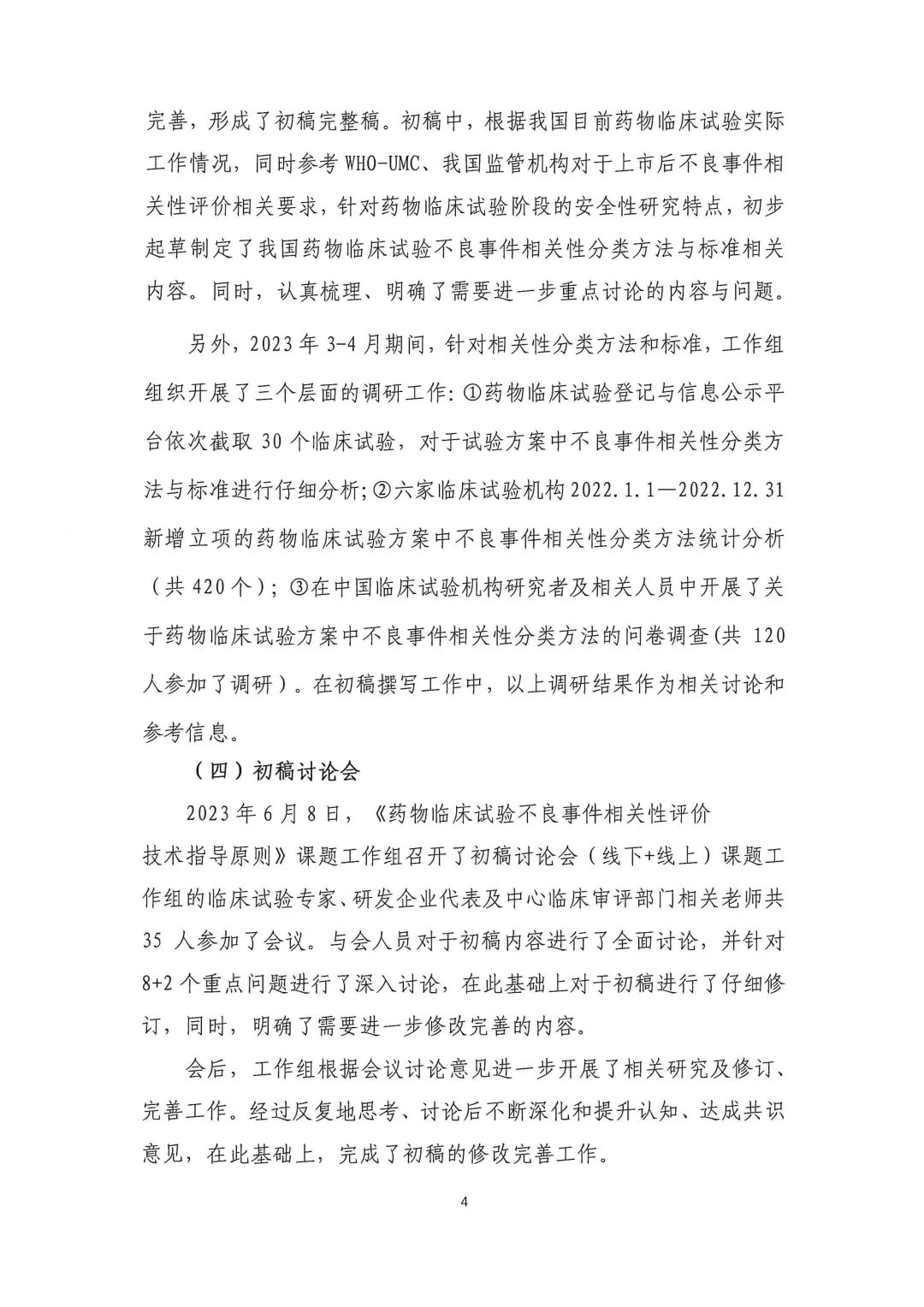 为了更好地开展药物临床试验期间安全性研究与风险管理工作,进一步明确相关技术标准,我中心组织起草了《药物临床试验不良事件相关性评价技术指导原则》,经工作组及中心内部讨论,已形成征求意见稿。
