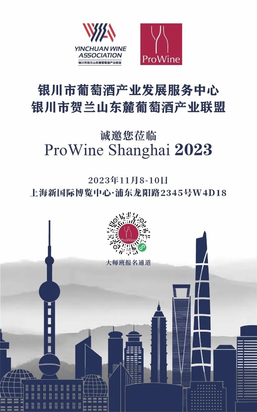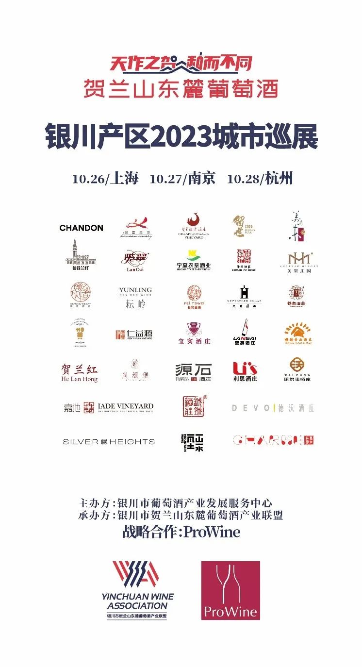银川市葡萄酒产业发展服务中心联合银川市贺兰山东麓葡萄酒产业联盟携手ProWine,演绎城市巡展精彩——贺兰山东麓葡萄酒银川产区2023城市巡展将于10月26日登陆华东三城——10月26日上海,10月27日南京,10月28日杭州。