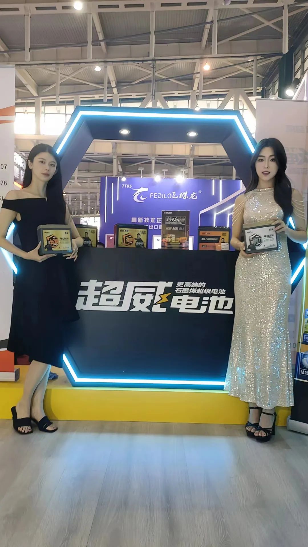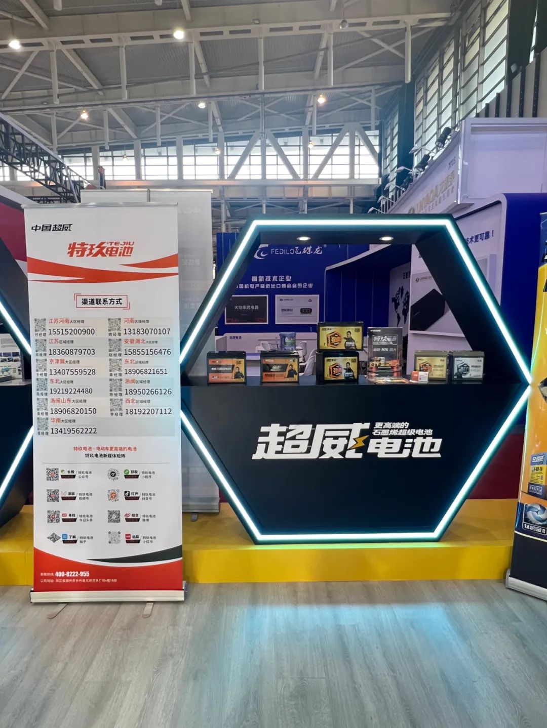 我们超威集团的总展台位于7号展馆入口处,一进入展馆大门,便能看到醒目的“超威”标识。我们的电池早已摆放就位,而工作人员也早已站在各自的岗位上。