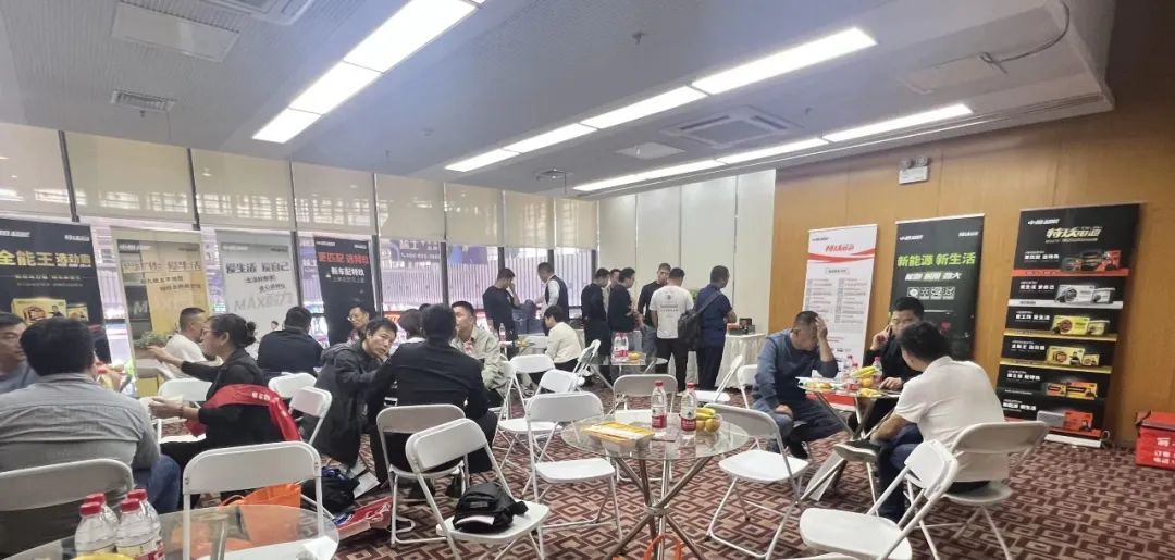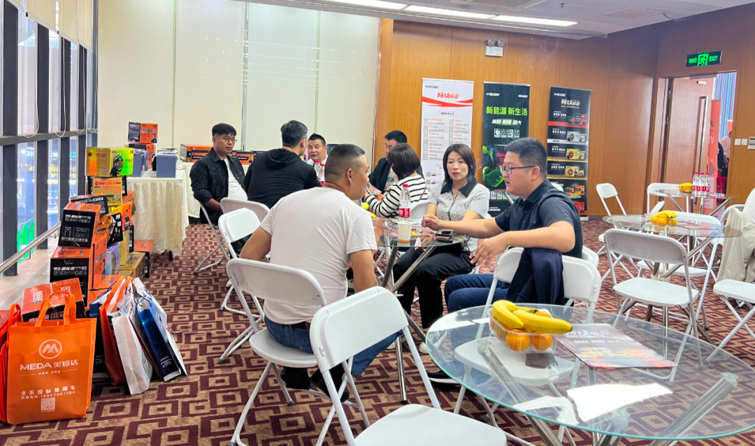 这间会议室布置得既宽敞又舒适,里面不仅摆放着一些桌椅和水果,让顾客们可以坐下来放松,还摆放着电池的塑壳和包装箱,让顾客直面感受特玖的电池产品。
