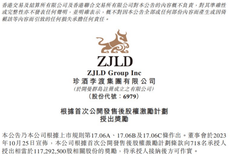 10月25日晚间,珍酒李渡集团发布公告,计划首次推出股权激励计划,向公司718名员工授予约1.1729亿份股权,本次激励计划授予的股权占公司股本总额的3.59%,授予价格为1港元/股。