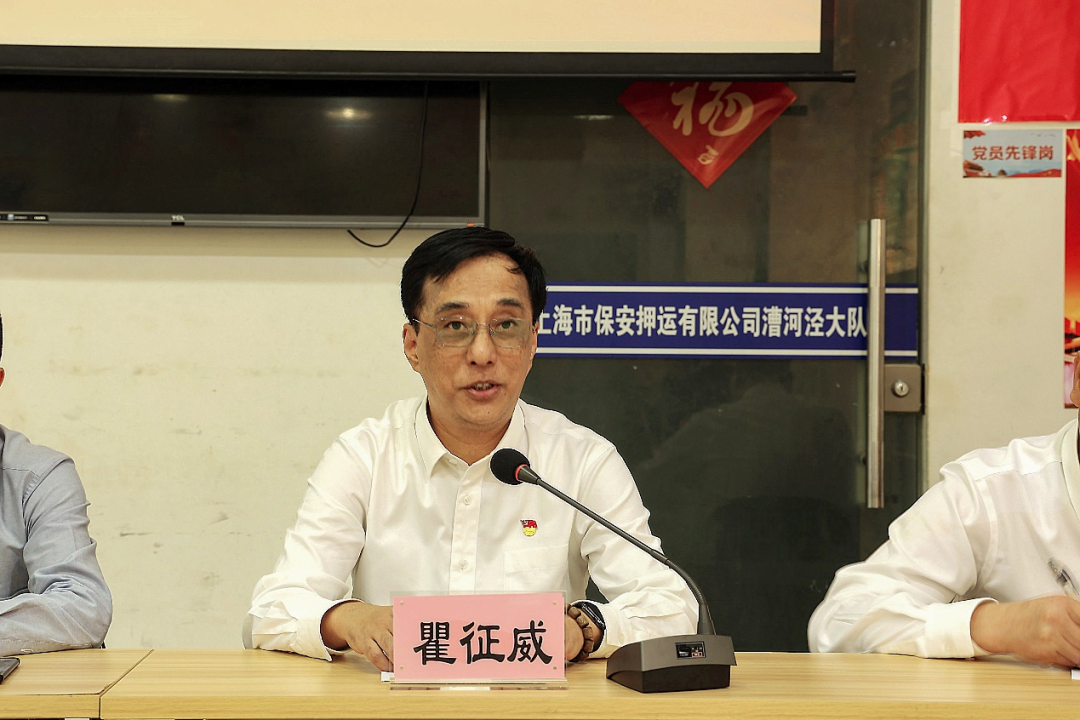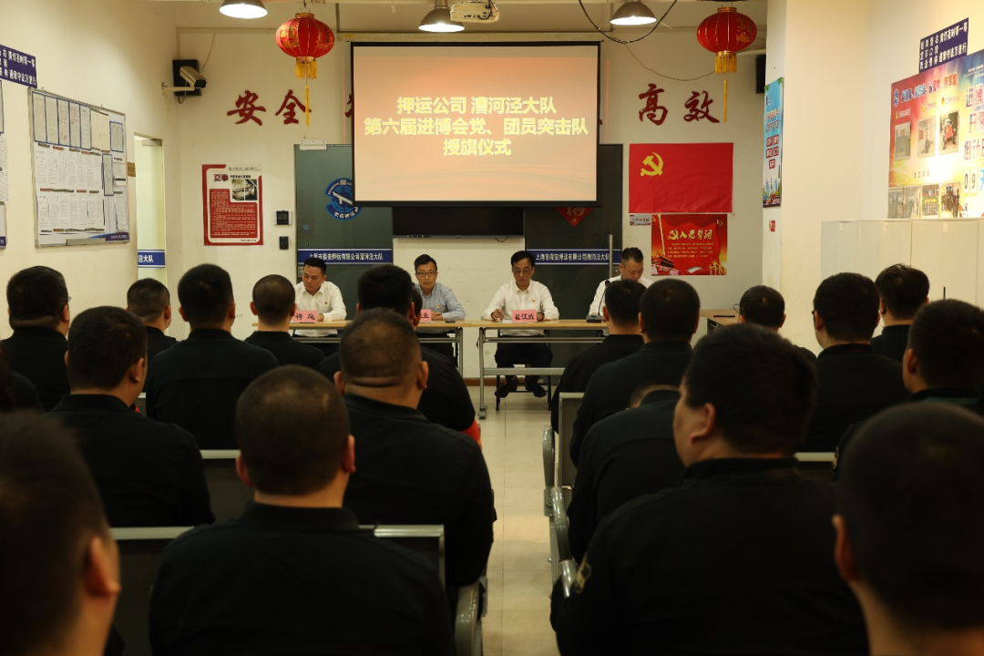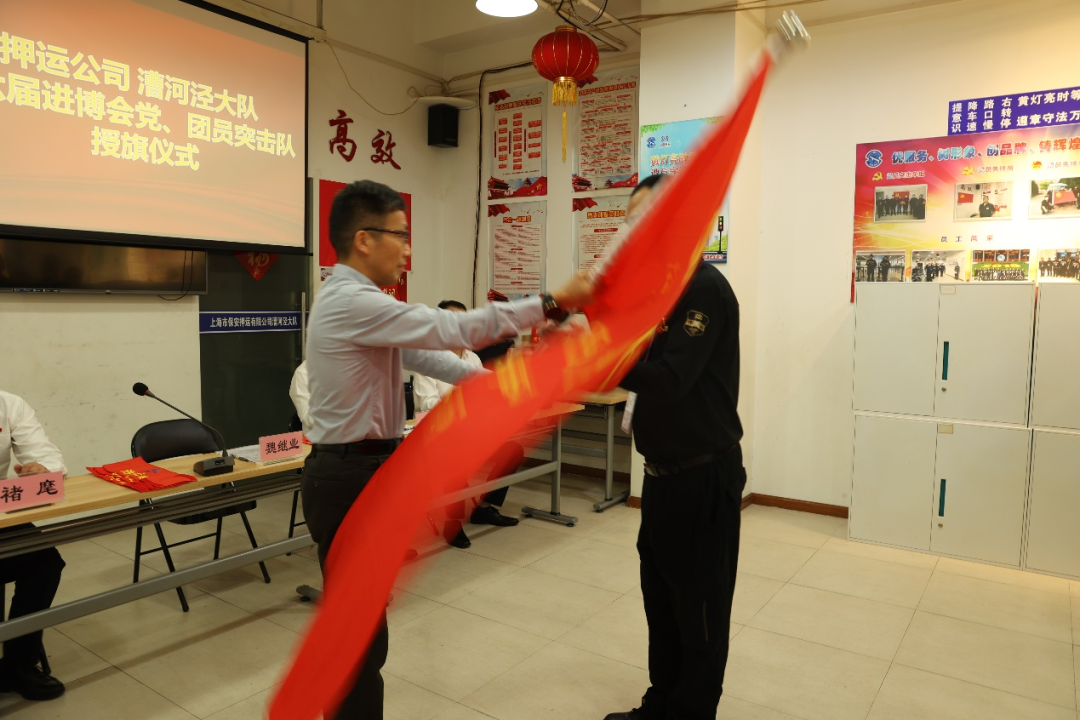 根据沪保安委〔2023〕20号《关于印发<市保集团第六届“进博会”安保战时党群工作方案>的通知》精神,为进一步激发共产党员、共青团员舍我其谁的担当精神,充分发挥先锋模范作用,团结引领押运队员在进博安保工作中攻坚克难、锐意进取,押运公司党总支在漕河泾大队,举行“先锋有我”主题党日活动暨漕河泾大队第六届进博会党团员突击队授旗仪式。公司党总支书记、总经理瞿征威,党总支委员褚麾、沈锋,以及押运管理一部第一党支部委员、漕河泾大队负责进博园区押运任务的党团员突击队员、押运队员代表近50人参加。集团党委副书记、总经理魏继业出席仪式。