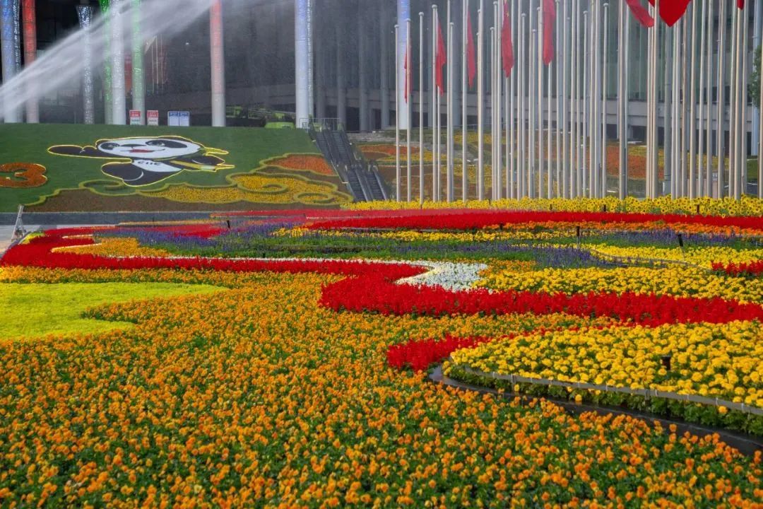 在整个广场空间中,“CIIE”和“2023”字样、四层梯田花海、迷宫花园等多个主题花园采用橙色孔雀草、黄色孔雀草、红色百日草、角堇等各色花卉植物来演绎祥云、渐变云山的纹样效果。