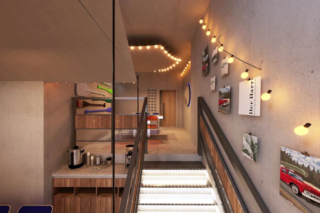 主要照明是天花板裸露的轨道射灯,局部落地灯和灯带匹配厚重的木质柜,既可以是现代露营简洁也可以是工业复古细节。