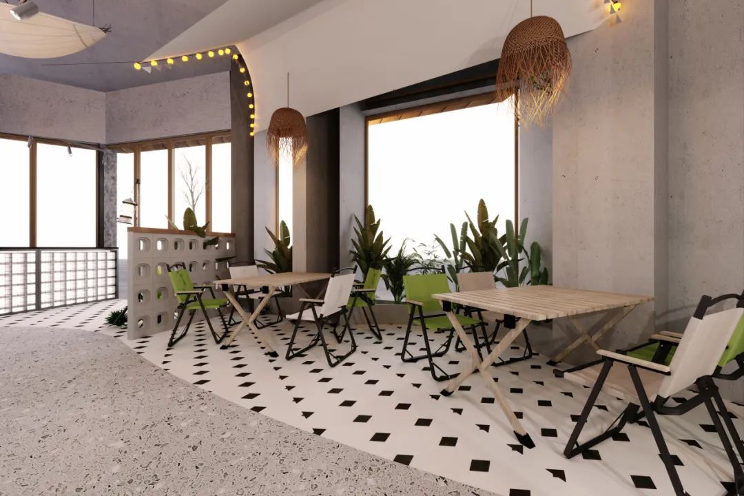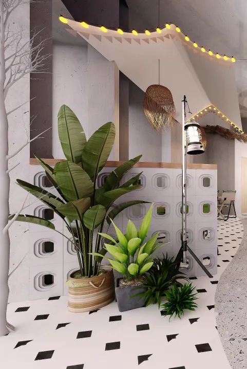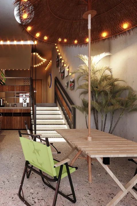 随心、自在、悠闲,方砖与粗粝的水磨石搭配水泥墙,露营风与工业风的结合瞬间脱离室内空间的束缚感,正式开启城市逃离计划。