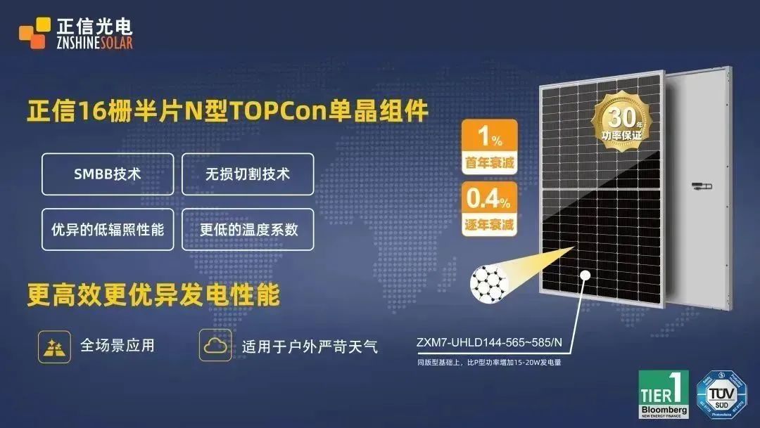 此外,正信TOPCon组件实现更大的发电功率和更高的发电效率,无需增加光照条件,可以为用户带来更丰厚的经济回报。为确保能源生产的可靠性和稳定性,正信光电的TOPCon组件采用了一系列先进技术,包括低衰减率和无损切割技术。TOPCon组件的衰减率仅为1%,远低于传统PERC组件,这意味着用户将享受到更持久的高发电效益,同时降低了维护和更换成本;无损切割技术进一步提高了组件的可靠性和稳定性,有效减少电池片损伤问题,使得TOPCon单晶组件在长期运行中能够保持高性能稳定性,以更好地适应各种复杂环境。