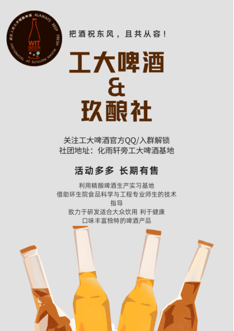 “玖酿社”于2022年9月成立,是一个由专业老师指导、全体学生均可参与的创新创业类社团。社团依托于武汉工程大学精酿实习与创业训练基地、环境生态与生物工程学院生物工程产品实训基地和创新创业基地,进行啤酒的设计、研发、生产、宣传、销售等一系列活动。
