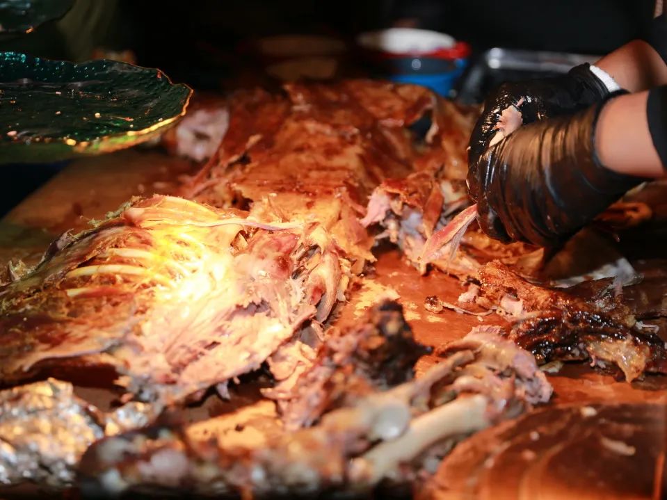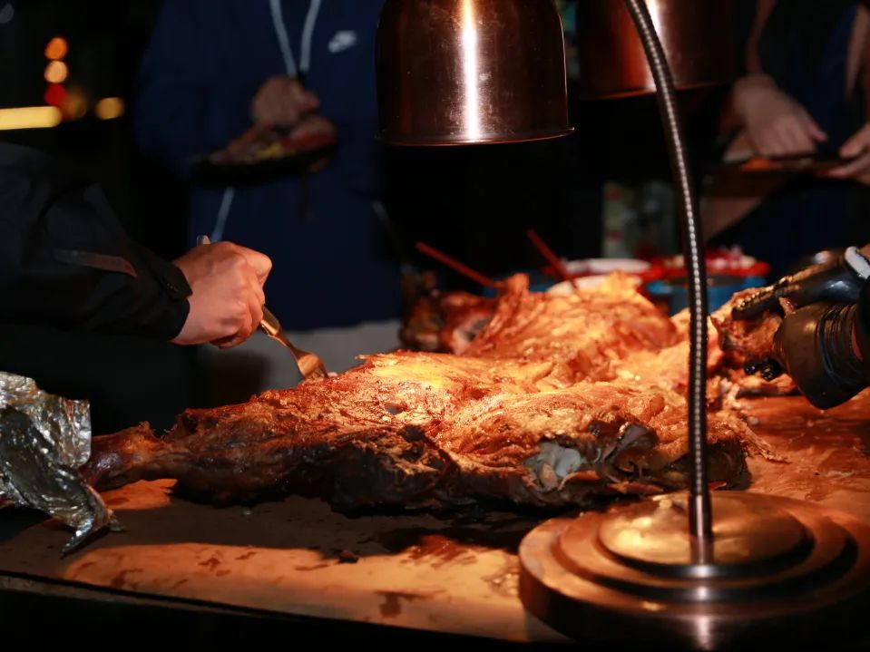 首先就是来宁夏必吃的烤全羊晚宴,留世酒庄特制的烤全羊,因为葡萄酒的加入给羊肉增添了诱人的果香和酒香,再撒上酒庄独家秘制的调料,色香味形俱全,鲜美不膻、外焦里嫩,吃起来别有一番风味。
