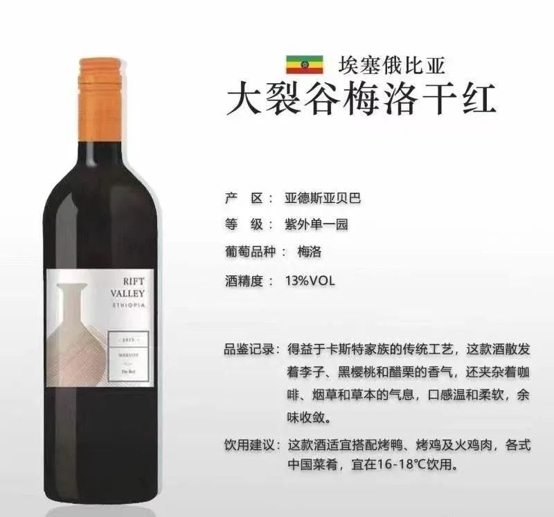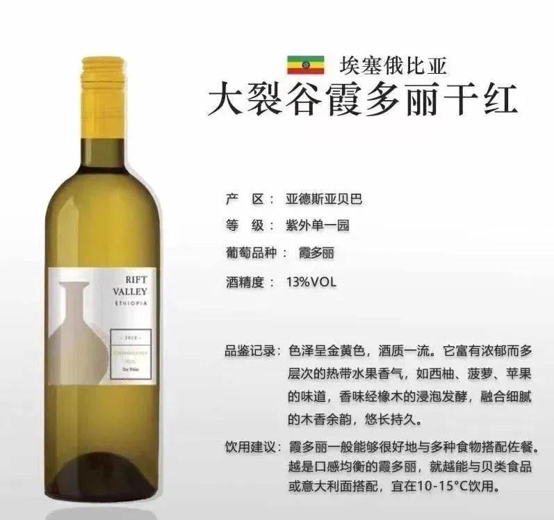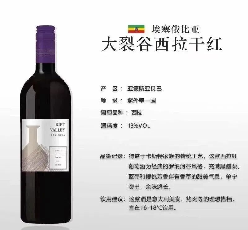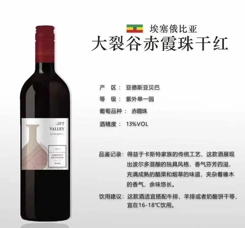你们最喜欢的葡萄酒产自哪里呢?最受媒体推广的是法国的葡萄酒,而葡萄酒的发源地则是格鲁吉亚,南非的葡萄酒也很有名,其实,不同地区的葡萄酒有不同的特色,没孰好孰劣之分。那么,来自非洲埃塞俄比亚的葡萄酒您听说过吗?我曾在去埃塞俄比亚紫薇湖旅行的途中经过一片绿油油的整齐的庄园,据说,那是法国最大的葡萄酒生产商卡斯特集团在埃塞Zeway地区投资的葡萄酒庄园。这个庄园位于埃塞俄比亚南部的马法省,占地约125公顷。葡萄庄园里大约种植了750000多株葡萄,都是国际品种,有美乐、赤霞珠、西拉和霞多丽。其中有一款大裂谷Rift