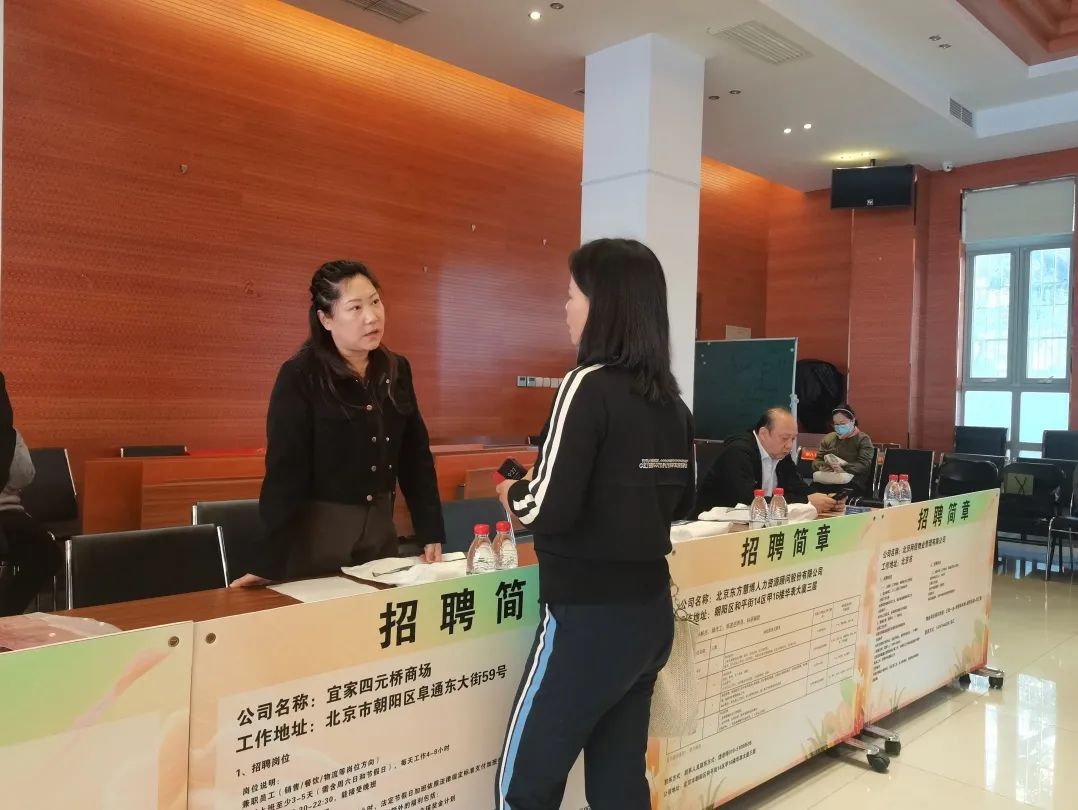 本次洽谈会共吸引了环宇祥和科技有限公司、宜家家居、北京金冠达房地产开发有限公司、易安仁才(北京)人力资源服务有限公司、家和管家、巨眼康视、安服物业、吉野家等多家用人单位,提供客户经理、储备店长、会计、行政文员、综合修理、消防中控、客服助理等近100个岗位,吸引了望京地区失业人员共计100余人参加。