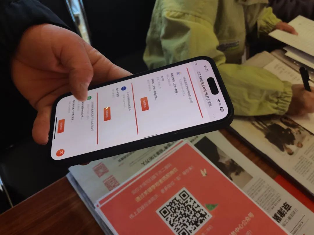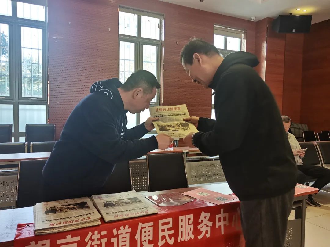 望京街道便民服务中心就业流动服务站工作人员为求职者讲解就业政策,现场没有找到心仪岗位的求职者,工作人员会向其介绍扫码关注“朝阳区人社局‘保用工 促就业’系列行动·重点企业秋季专场招聘”,寻找合适的就业岗位。