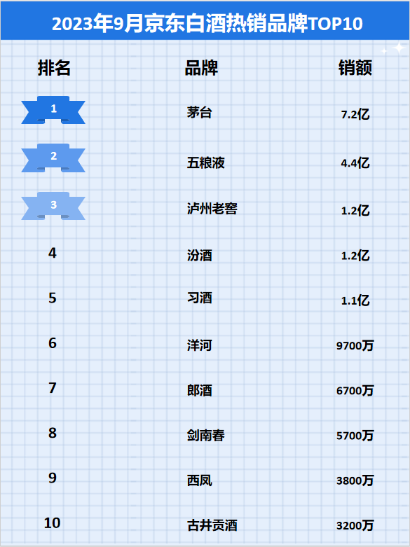 *数据源于鲸参谋-行业趋势分析(来自公开渠道获取,数据仅供参考)茅台和五粮液是白酒市场中的两大巨头,9月份两品牌的月销额分别为7.2亿+、4.4亿+,市占分别约31%和19%。从销售数据上看,9月份茅台一系列的联名活动也带动了销售的增长,环比来看,茅台9月的销售额较8月份增长约36%,同比去年同期增长超过85%。此外,环比来看,TOP10品牌的销量销额均呈增长趋势,包括五粮液、泸州老窖、汾酒、习酒等等。