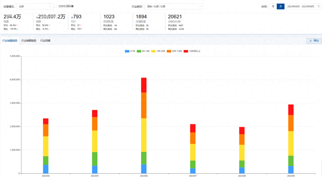 9月白酒市场的整体热度较高,贵州茅台先是与瑞幸联名推出酱香拿铁,后又宣布与德芙推出联名产品酒心巧克力,引起了诸多消费者的关注。在这一热度的加持下,从销售上看,9月白酒的销售表现也比较好。鲸参谋数据显示,9月份京东平台上白酒的月销量为290万+,环比8月增长48%;销售额为23亿+,环比8月增长51%。