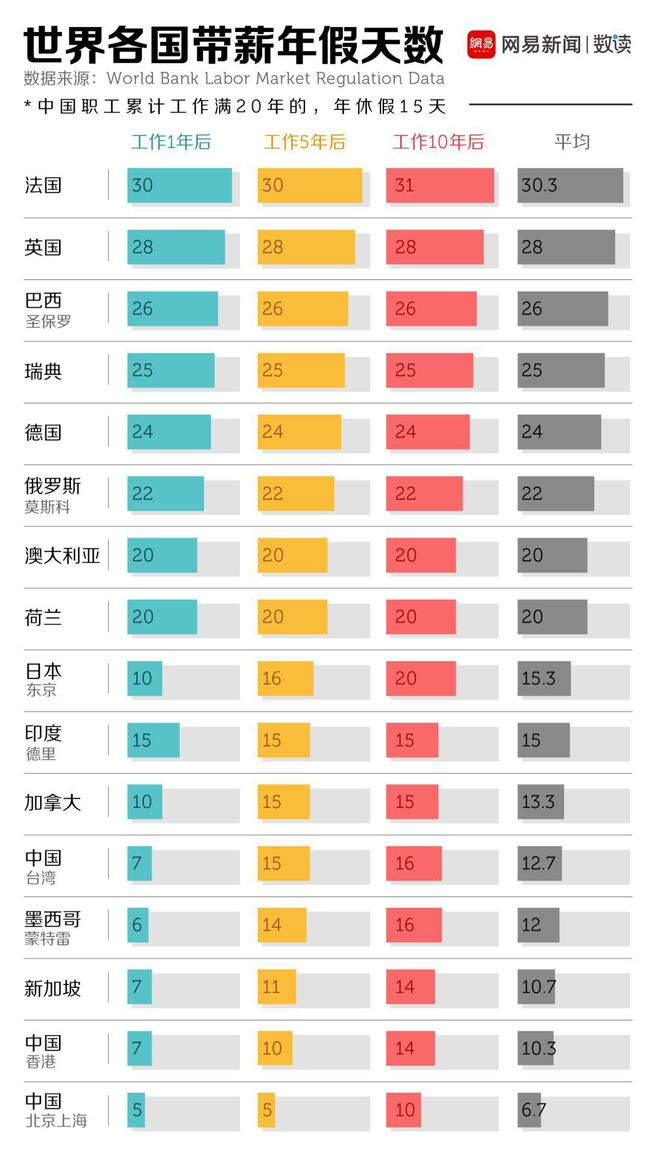 从上图中不难看出,发展中国家的带年假相对发达国家而言较少。大部分发展中国家带薪年假为两周左右,还不到欧洲发达国家的一半。