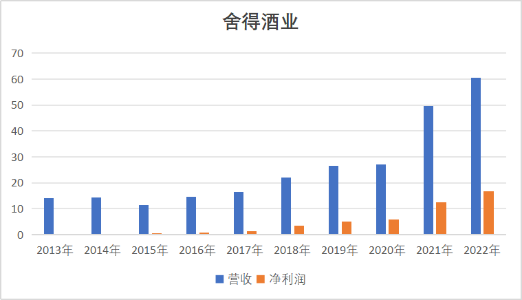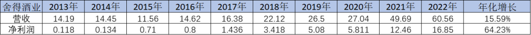 舍得这10年在营收方面取得了年化,15.59%的增长。在净利润方面更是取得了年化64.64%的增长。