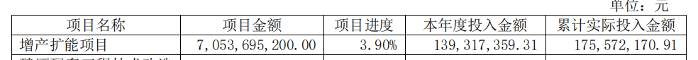 从2023年的半年报来看的话,这项增产扩能项目进展缓慢。项目进度为3.9%。累计投入为预算的2.49%。