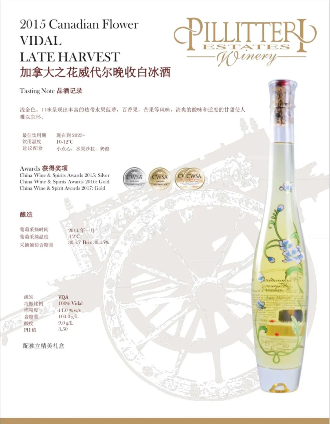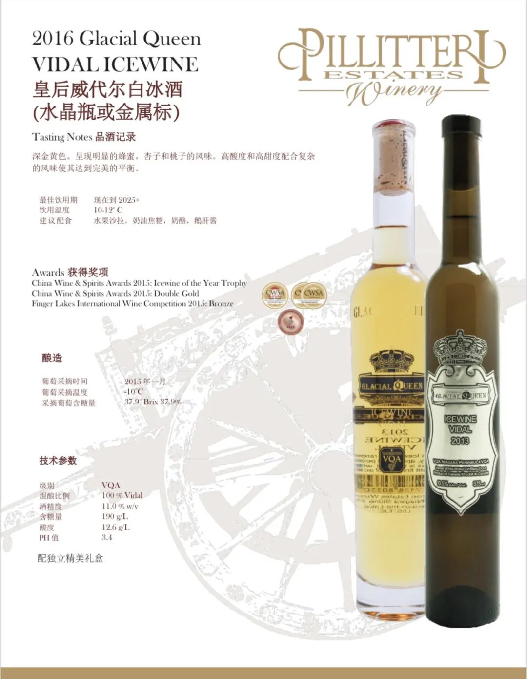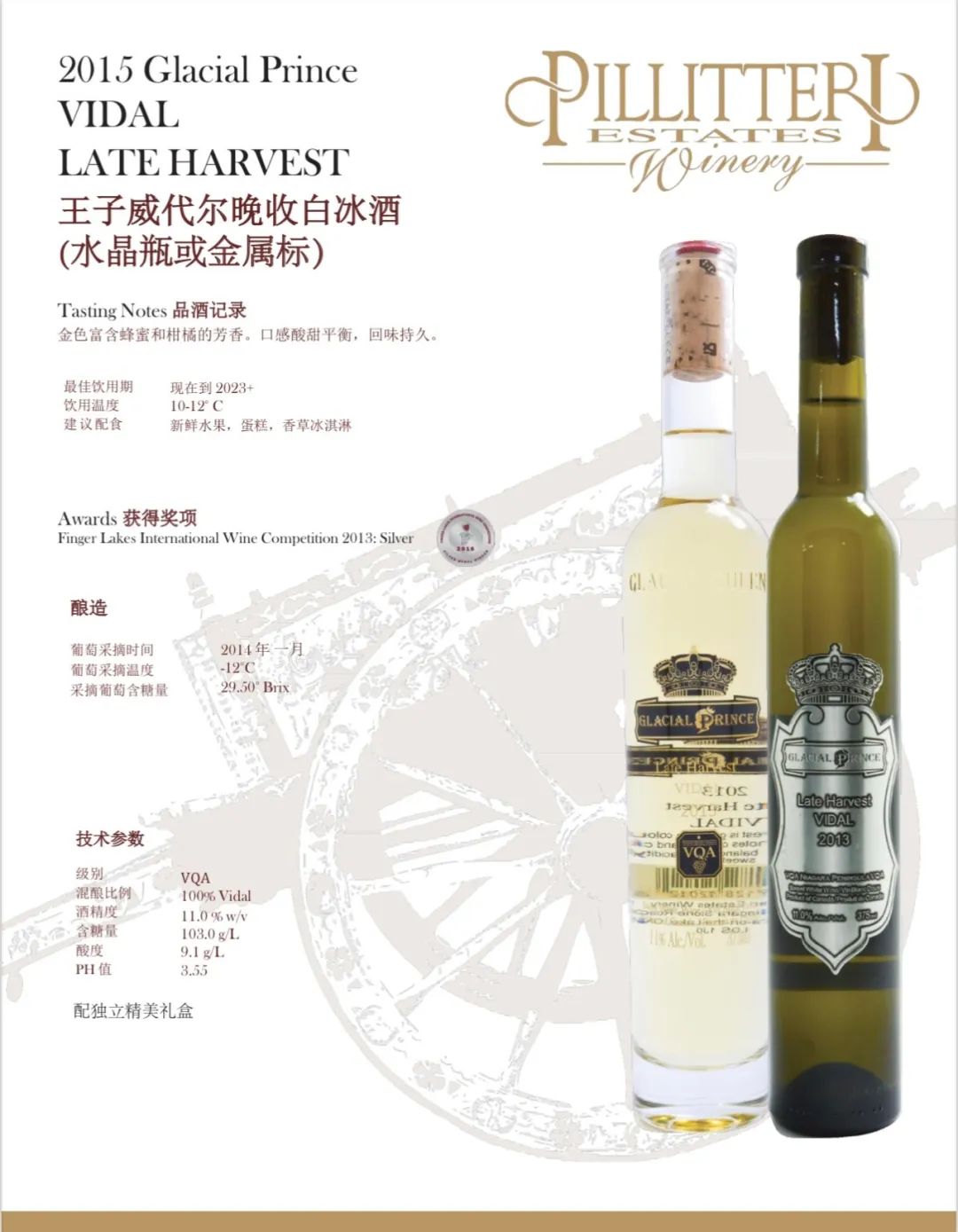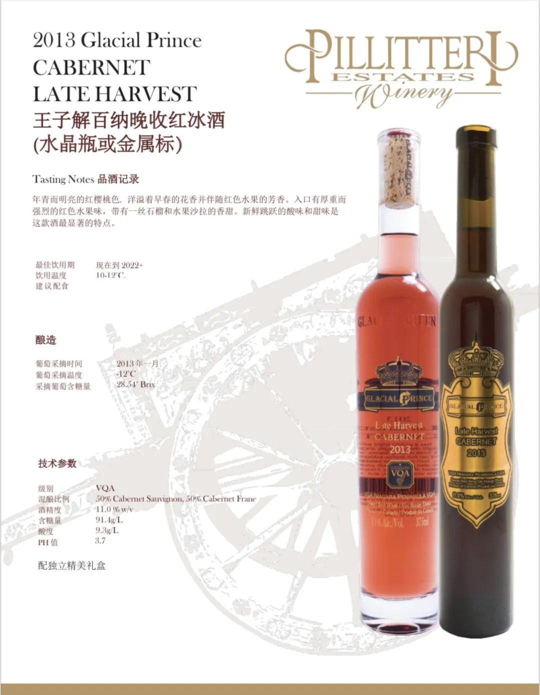 Pillitteri Estates Winery晚收系列葡萄酒使用的葡萄来自派利特瑞酒庄葡萄园。每个葡萄园和葡萄酒都 是单独对待的,因为每个都有它们自己必须表达 出来的“个性”。派利特瑞酒庄的目标是为他们的消费者生产一致的、高质量的葡萄酒:醇厚、浓郁的红葡萄酒; 芬芳活泼的白葡萄酒,风格多样,适合各种 不同的口味。