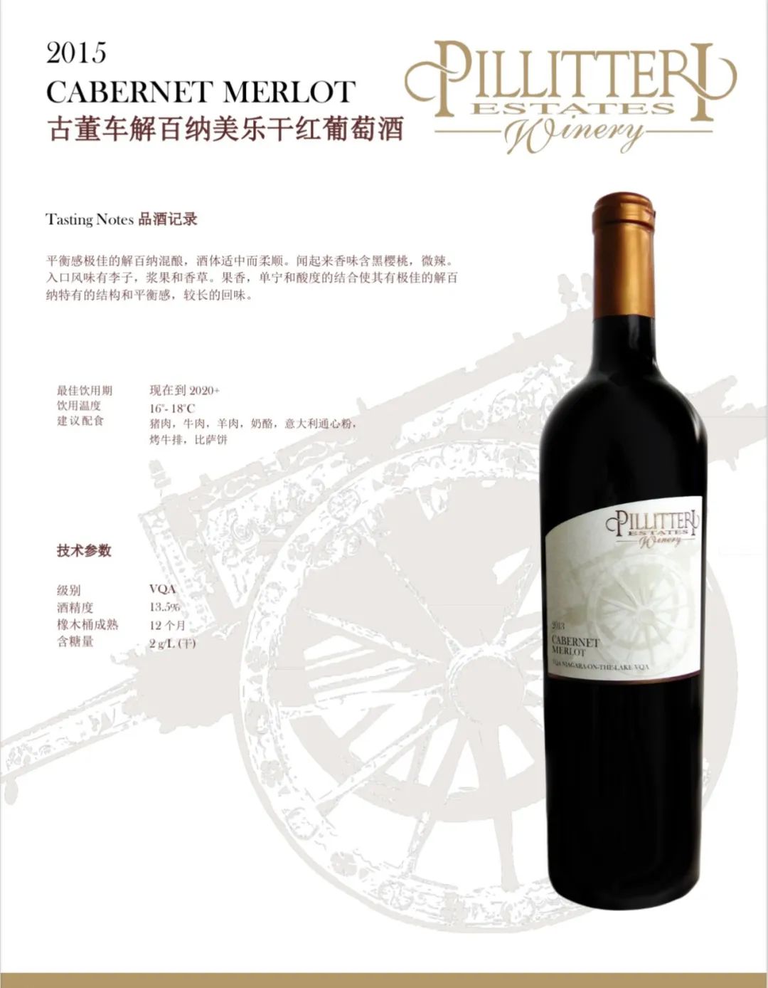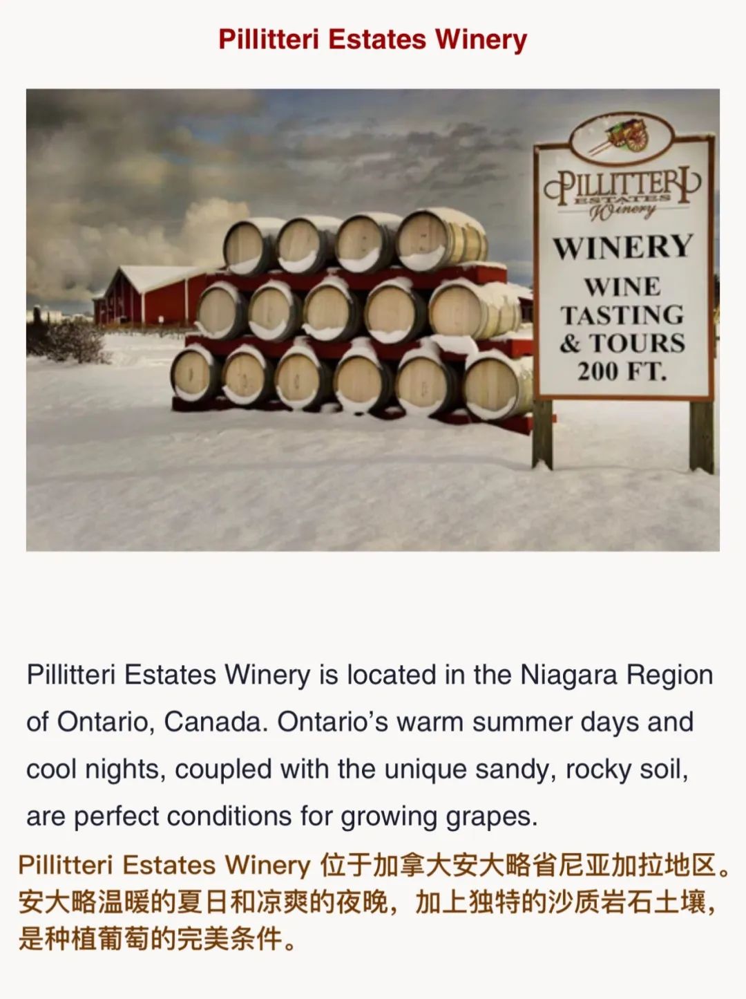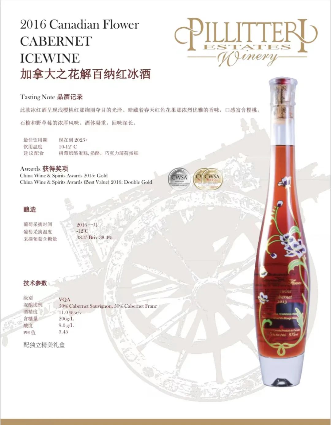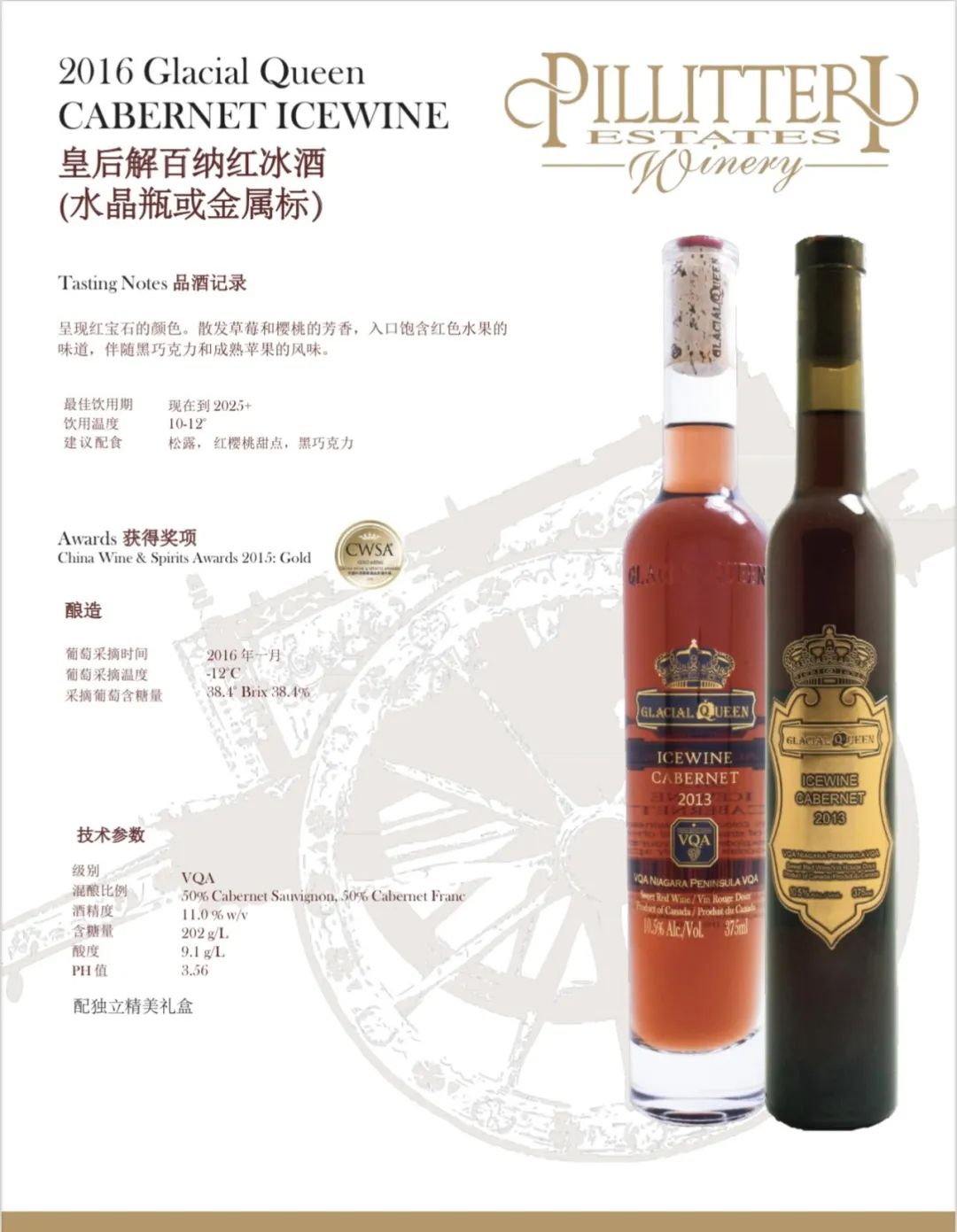 Pillitteri Estates Winery晚收系列葡萄酒使用的葡萄来自派利特瑞酒庄葡萄园。每个葡萄园和葡萄酒都 是单独对待的,因为每个都有它们自己必须表达 出来的“个性”。派利特瑞酒庄的目标是为他们的消费者生产一致的、高质量的葡萄酒:醇厚、浓郁的红葡萄酒; 芬芳活泼的白葡萄酒,风格多样,适合各种 不同的口味。