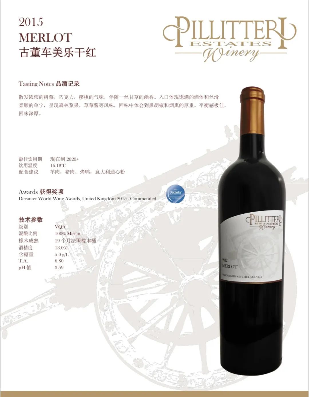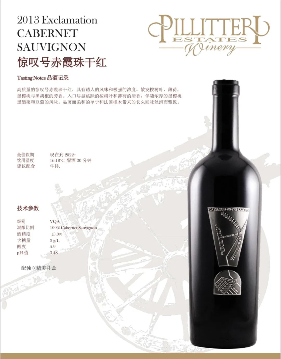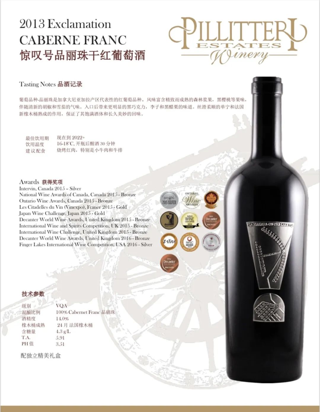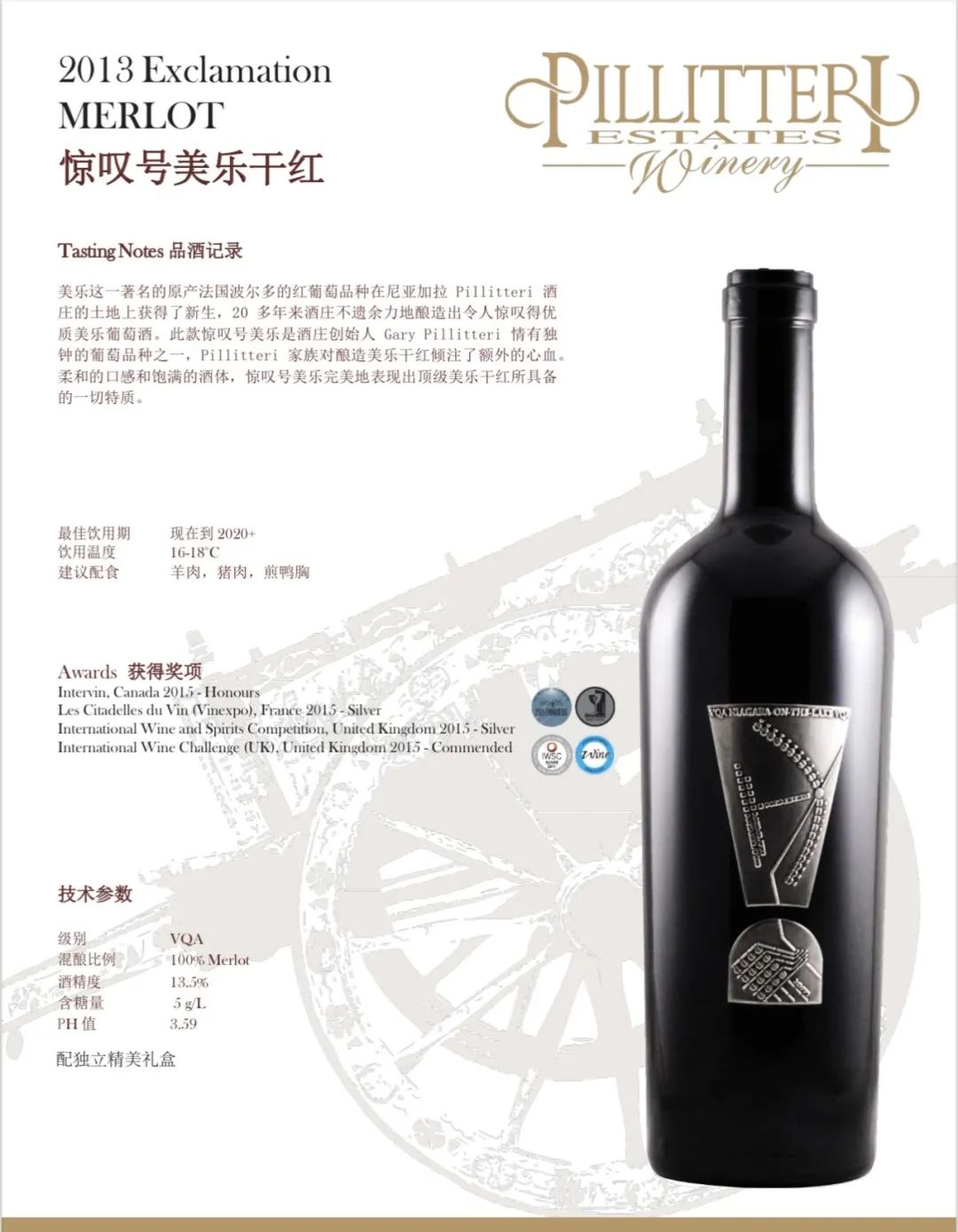 Pillitteri Estates Winery晚收系列葡萄酒使用的葡萄来自派利特瑞酒庄葡萄园。每个葡萄园和葡萄酒都 是单独对待的,因为每个都有它们自己必须表达 出来的“个性”。派利特瑞酒庄的目标是为他们的消费者生产一致的、高质量的葡萄酒:醇厚、浓郁的红葡萄酒; 芬芳活泼的白葡萄酒,风格多样,适合各种 不同的口味。