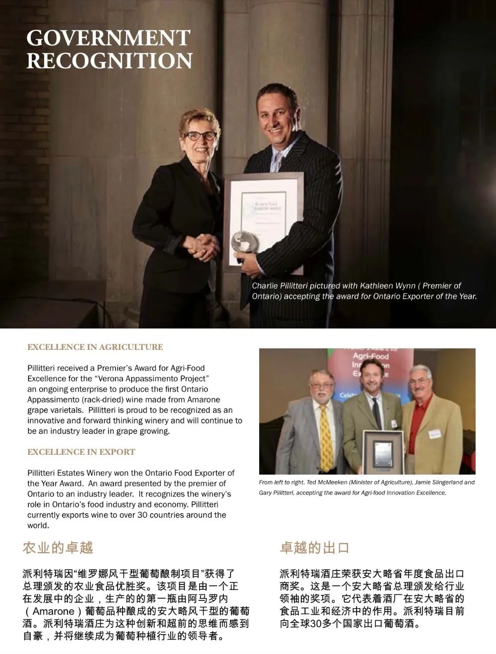 自1948年到达加拿大尼亚加拉以来,派利特瑞家 庭一直致力于创造一个可以让后代追随的遗赠。现在,经过六十年后,派利特瑞酒庄自豪地延续 着葡萄栽培和卓越酿酒的家族传统。家族中三代人积极参与酒厂的运作,可以说我们 酿造的每一瓶葡萄酒都是我们家族激情的结晶。我们很自豪能够与世界各地的葡萄酒爱好者分享 我们的劳动成果,并认为每一个享用一杯派利特 瑞葡萄酒的人都是我们家庭的一员。