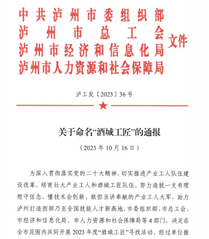今年6月,泸州市委组织部、市总工会、市经济和信息化局、市人力资源和社会保障局联合开展了“寻找酒城工匠”活动,旨在甄选出一批德才兼备的产业工人和技能人才,授予“酒城工匠”称号。经过单位推荐、资格审查、专家评审、社会投票和综合审定等一系列严格筛选后,经公示,共有50名泸州市优秀人才获得了该表彰。
