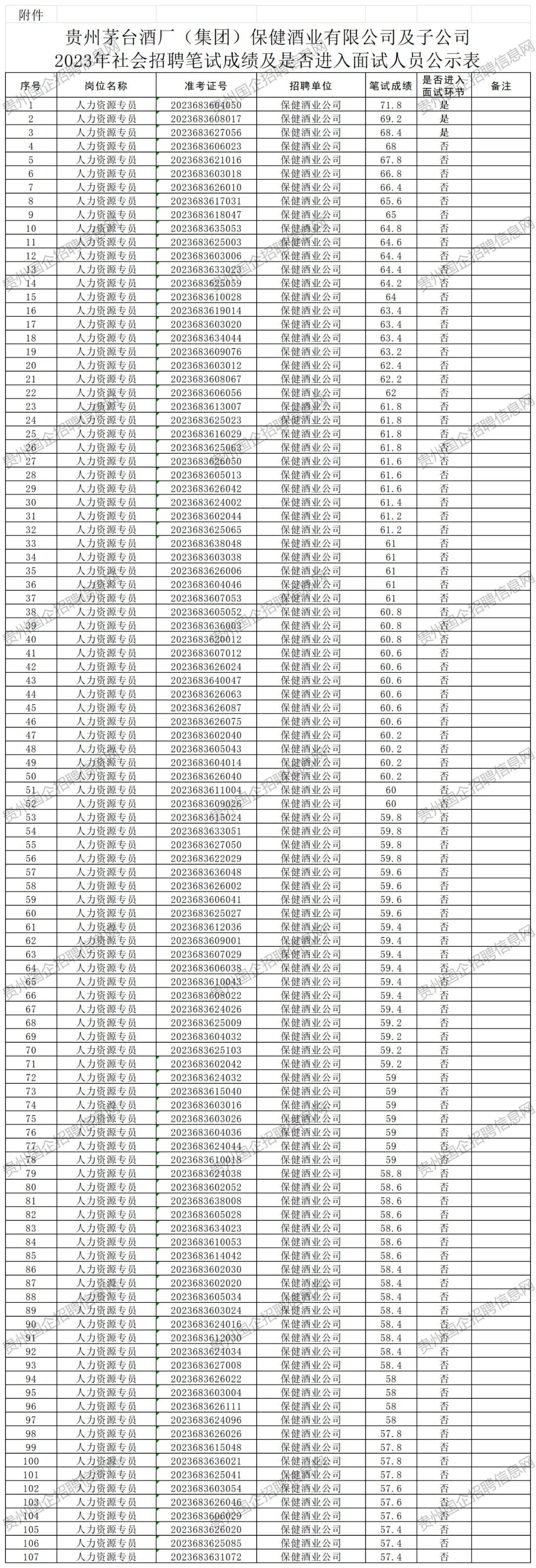 贵州茅台酒厂(集团)保健酒业有限公司及子公司2023年社会招聘笔试工作已顺利完成,根据《贵州茅台酒厂(集团)保健酒业有限公司及子公司2023年社会招聘公告》规定,现将笔试成绩及是否进入面试人员予以公示(详见附件)。