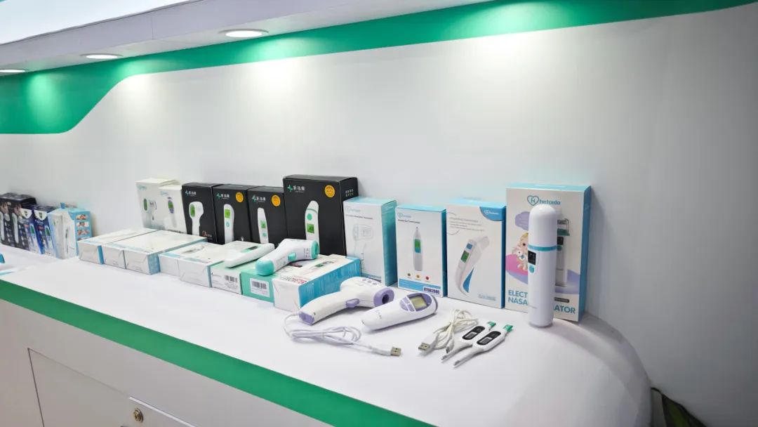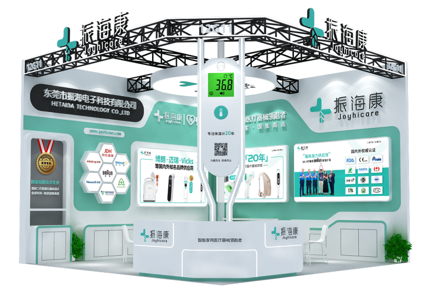 振海医疗,简约科技感展馆,绿色医疗风主题,彰显科技改变生活的生命力,从细节出发,将智能家用医疗器械分类陈列,吸引了无数客商的目光。