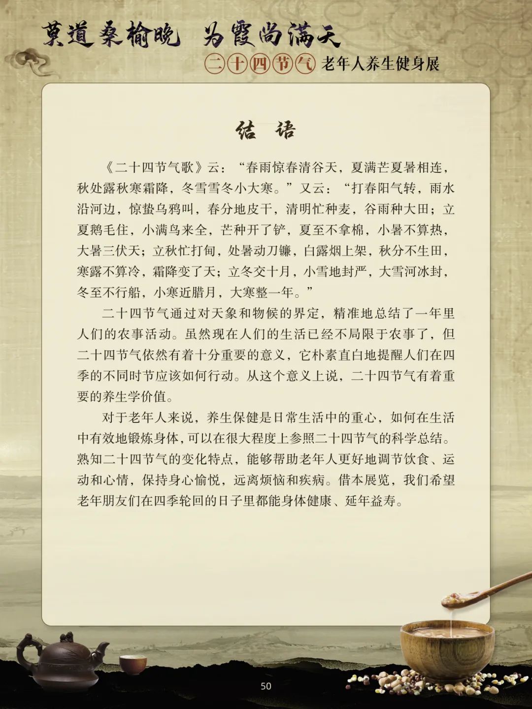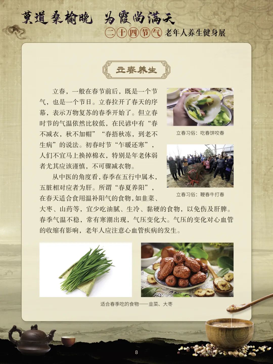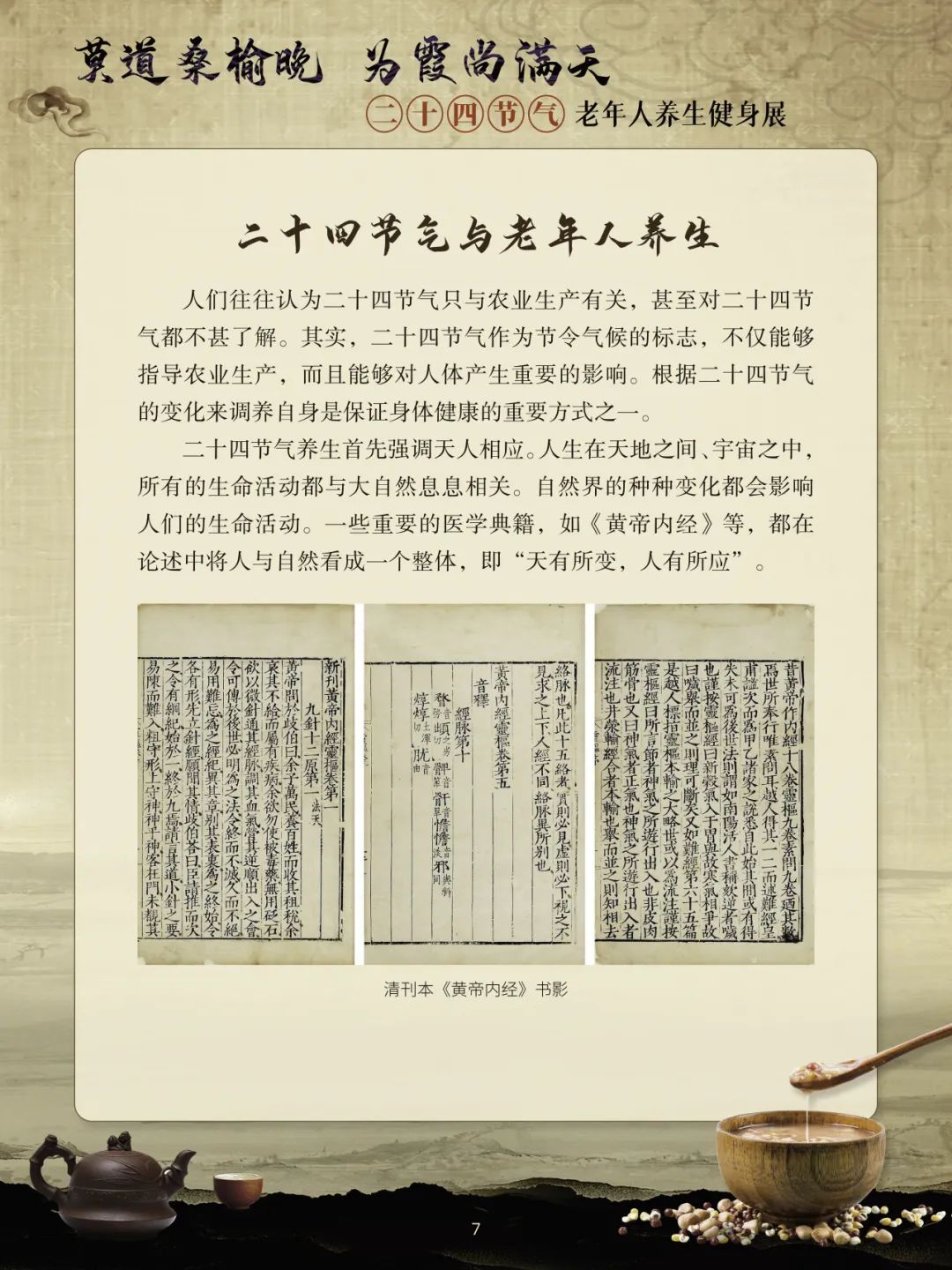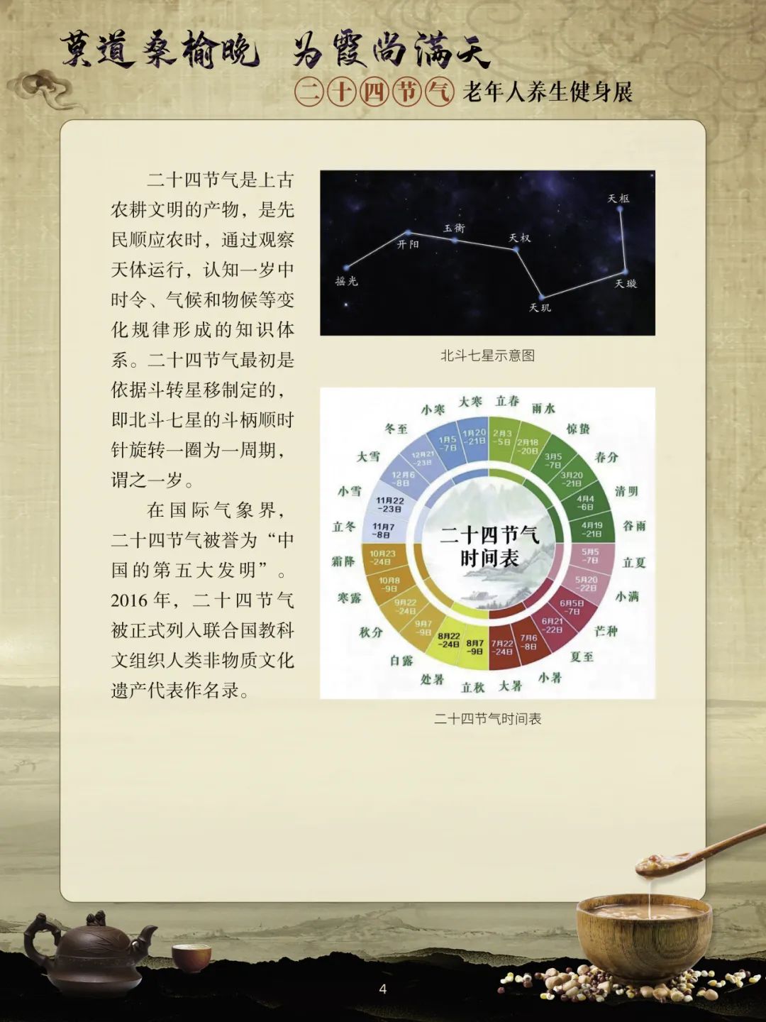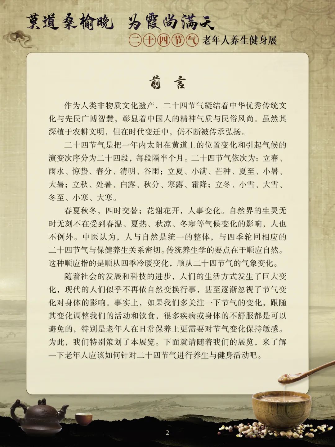 随着社会的发展和科技的进步,人们的生活方式发生了巨大变化,现代的人们似乎不再依自然变换行事,甚至逐渐忽视了节气变化对身体的影响。事实上,如果我们多关注一下节气的变化,跟随其变化调整我们的活动和饮食,很多疾病或身体的不舒服都是可以避免的,特别是老年人在日常保养上更需要对节气变化保持敏感。为此,我们特别策划了本展览。下面就请随着我们的展览,来了解一下老年人应该如何针对二十四节气进行养生与健身活动吧。