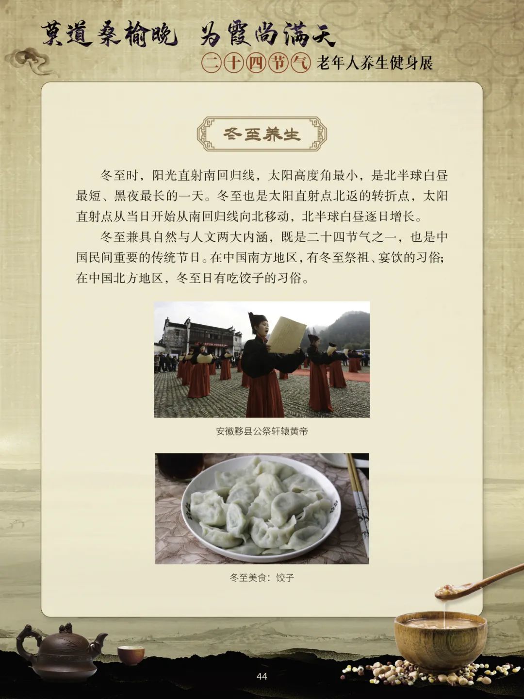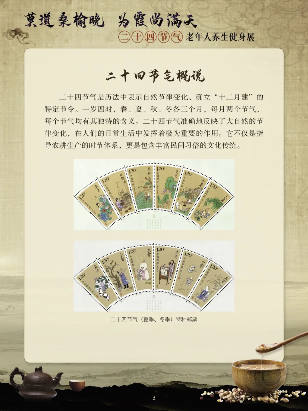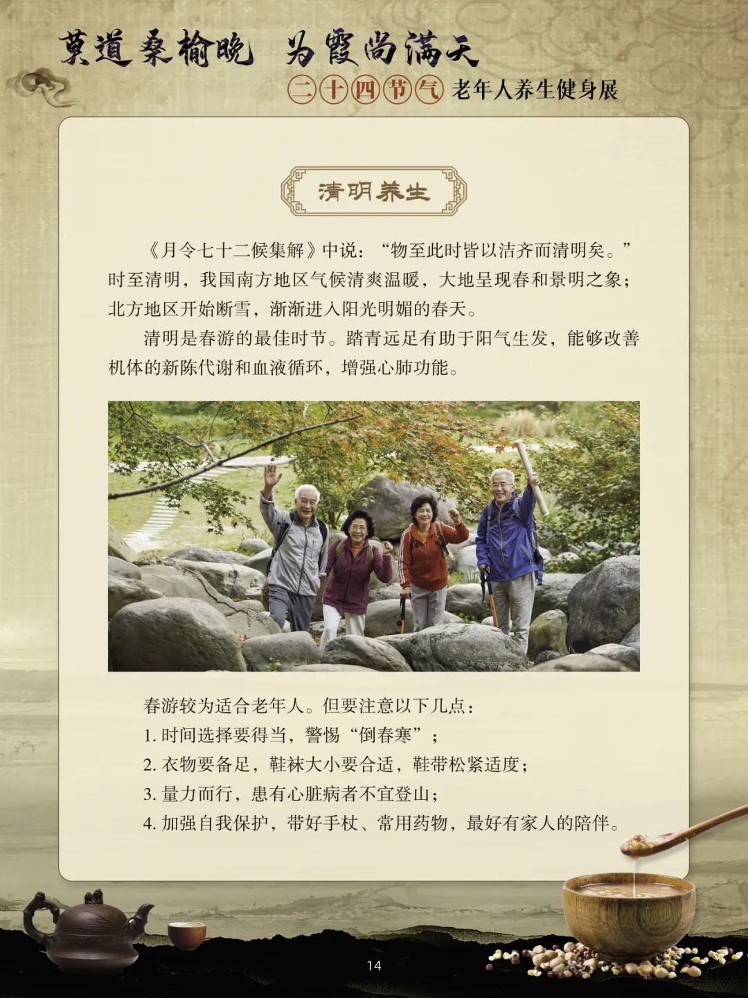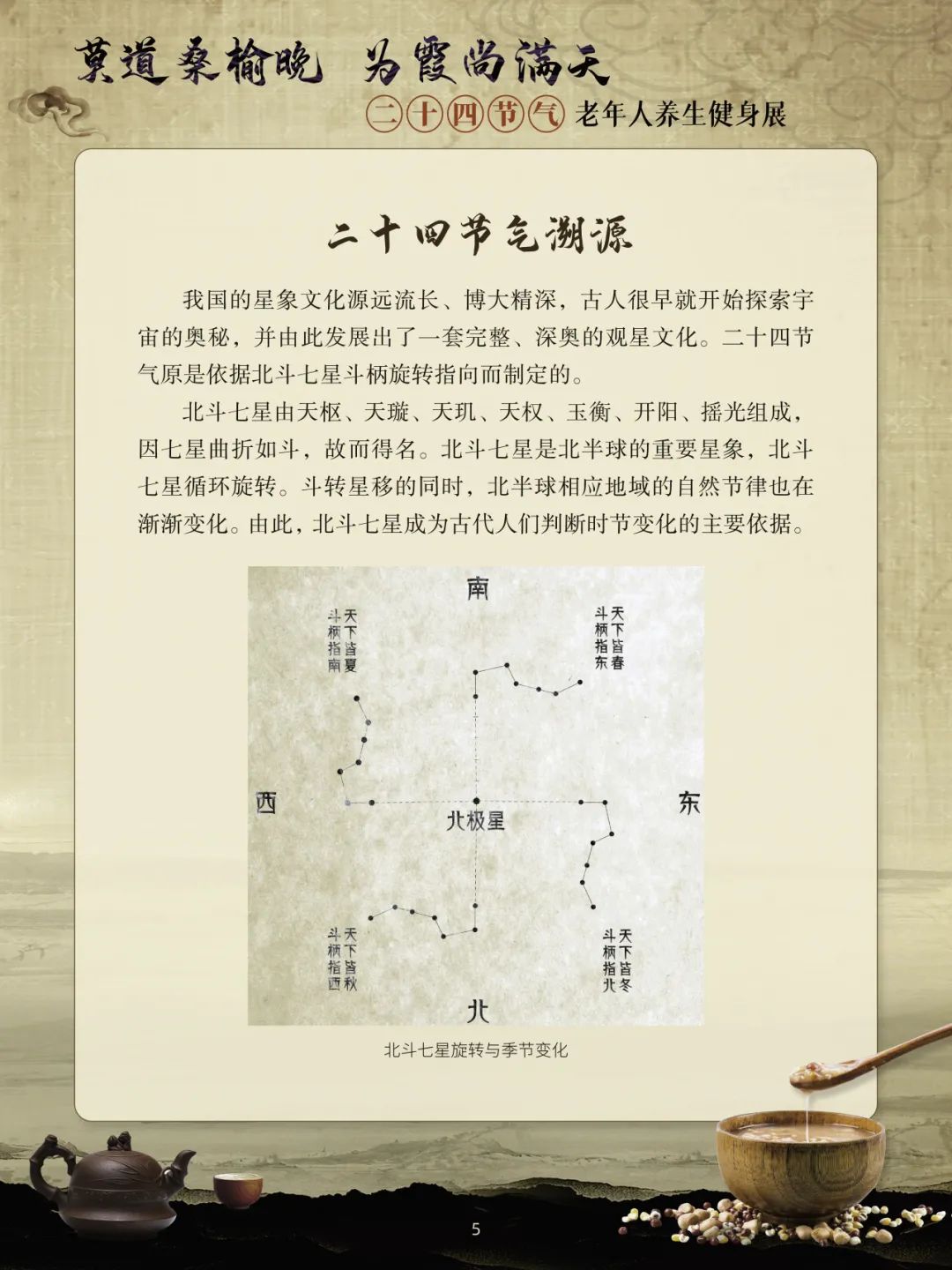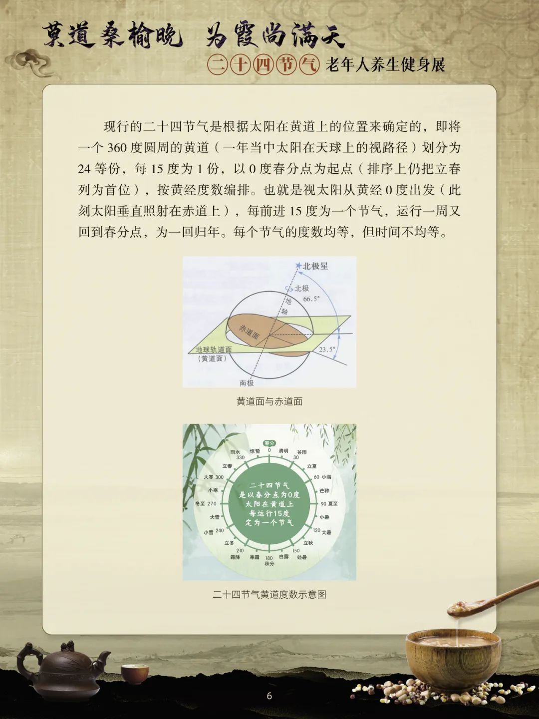 随着社会的发展和科技的进步,人们的生活方式发生了巨大变化,现代的人们似乎不再依自然变换行事,甚至逐渐忽视了节气变化对身体的影响。事实上,如果我们多关注一下节气的变化,跟随其变化调整我们的活动和饮食,很多疾病或身体的不舒服都是可以避免的,特别是老年人在日常保养上更需要对节气变化保持敏感。为此,我们特别策划了本展览。下面就请随着我们的展览,来了解一下老年人应该如何针对二十四节气进行养生与健身活动吧。