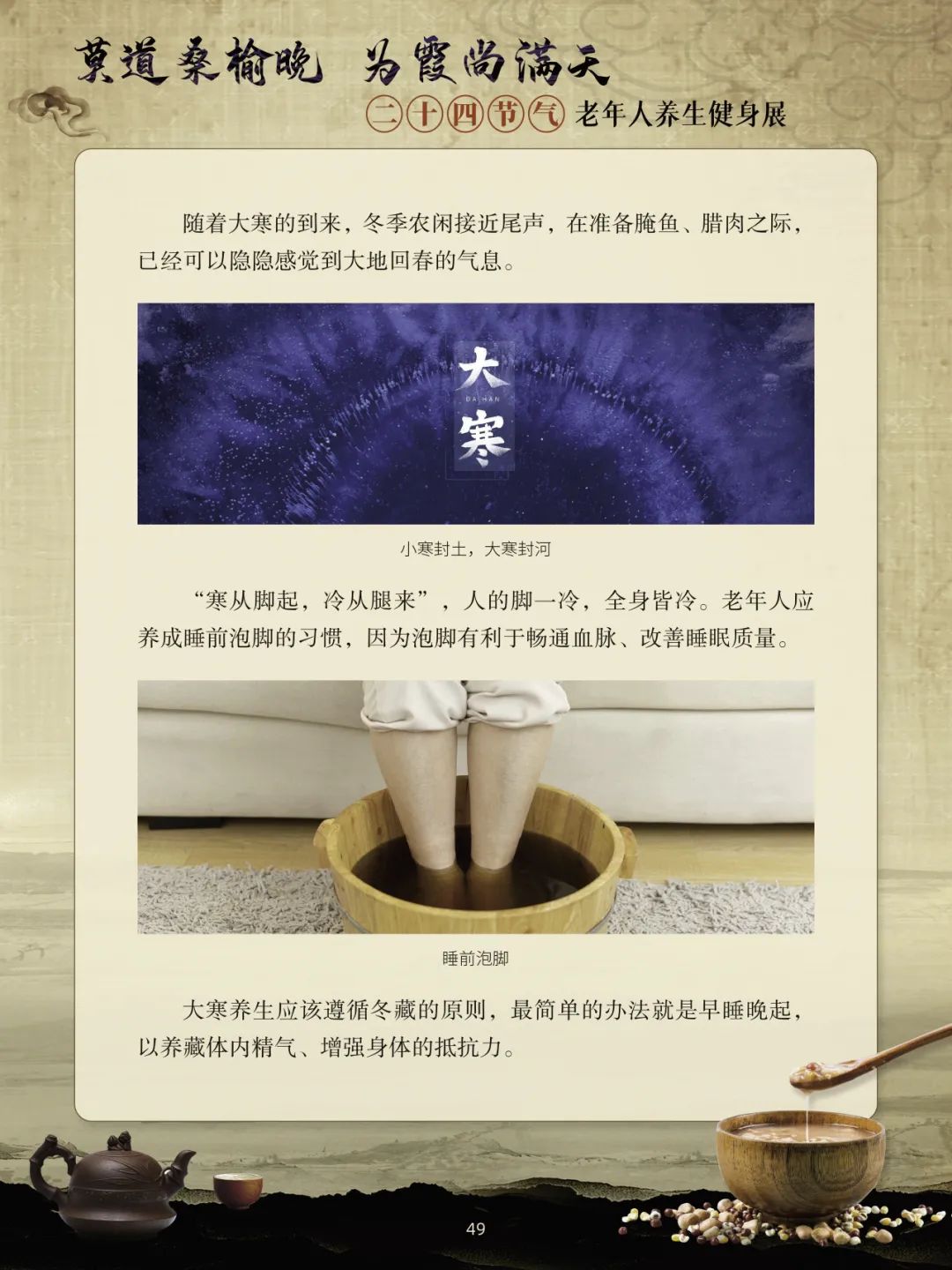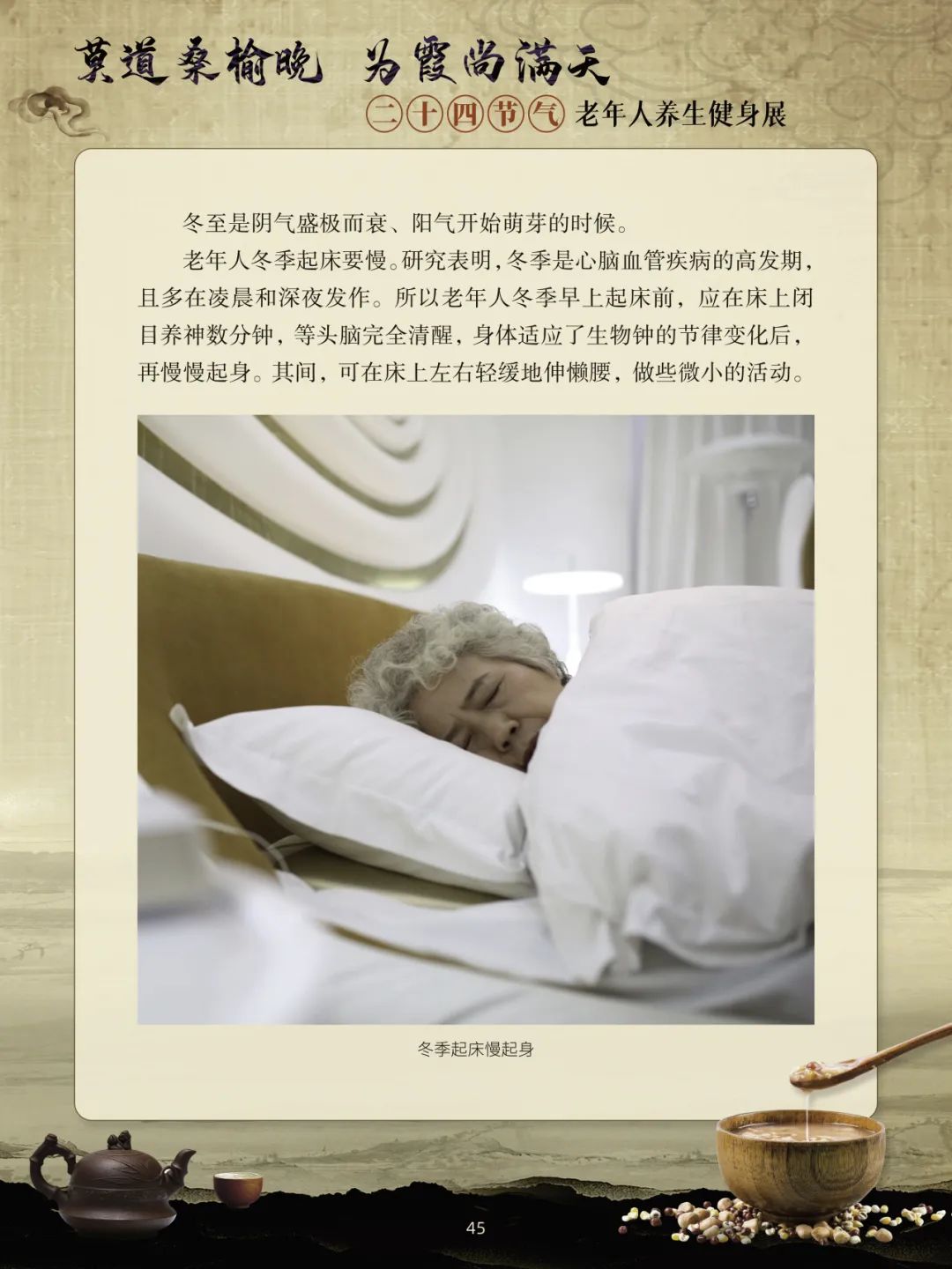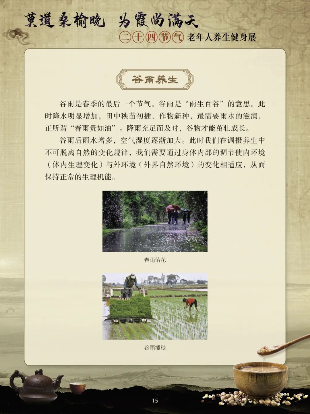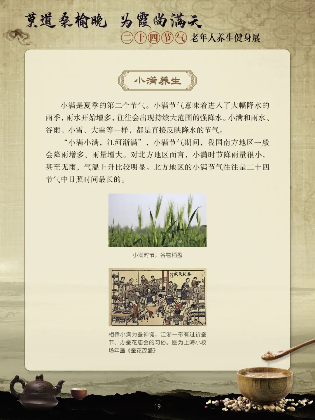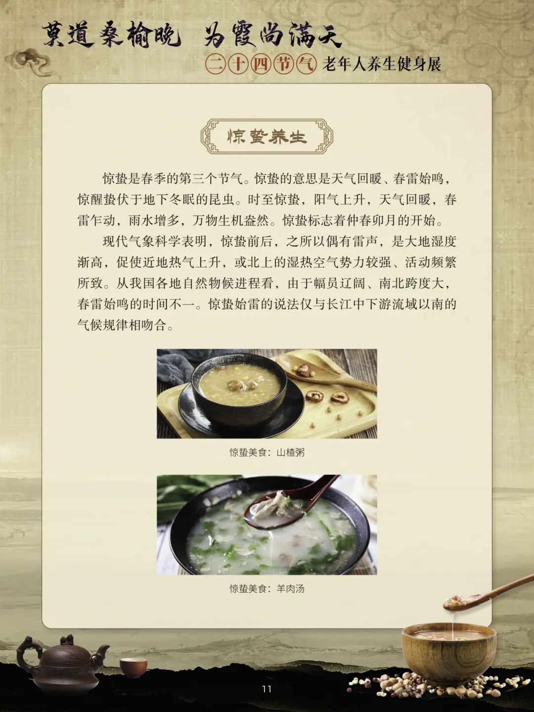 随着社会的发展和科技的进步,人们的生活方式发生了巨大变化,现代的人们似乎不再依自然变换行事,甚至逐渐忽视了节气变化对身体的影响。事实上,如果我们多关注一下节气的变化,跟随其变化调整我们的活动和饮食,很多疾病或身体的不舒服都是可以避免的,特别是老年人在日常保养上更需要对节气变化保持敏感。为此,我们特别策划了本展览。下面就请随着我们的展览,来了解一下老年人应该如何针对二十四节气进行养生与健身活动吧。