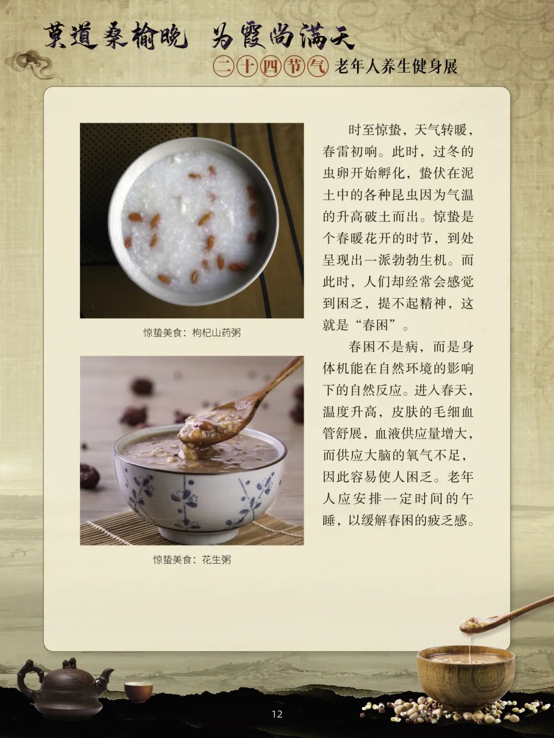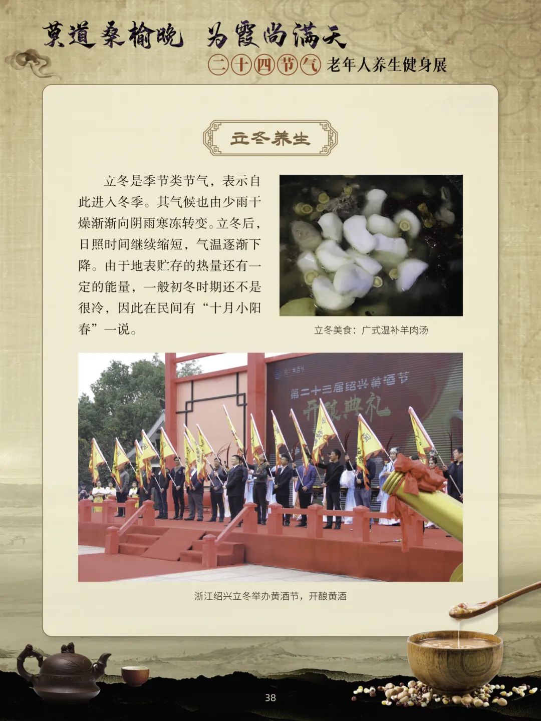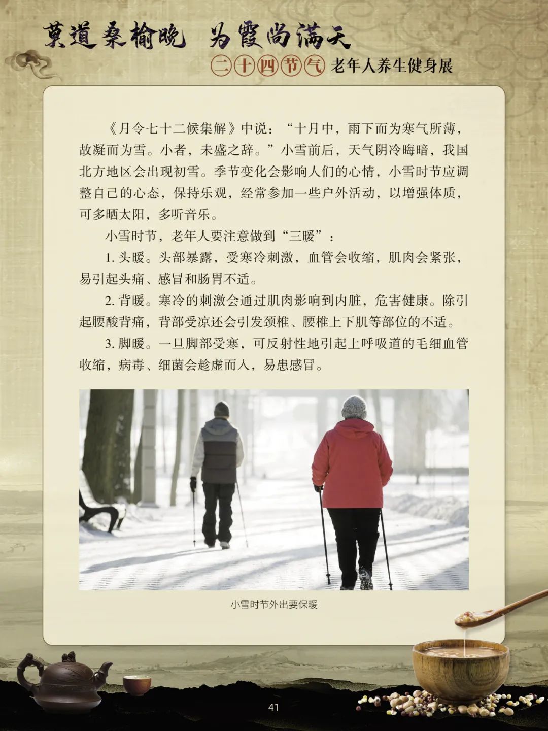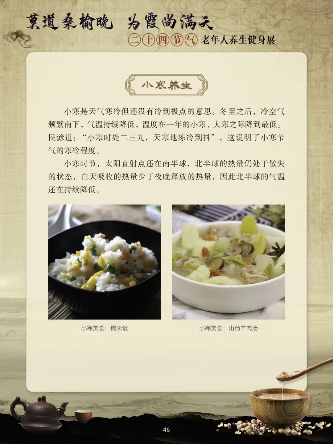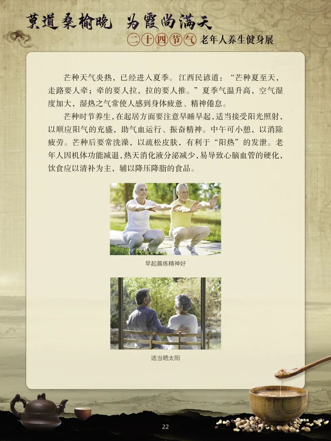 随着社会的发展和科技的进步,人们的生活方式发生了巨大变化,现代的人们似乎不再依自然变换行事,甚至逐渐忽视了节气变化对身体的影响。事实上,如果我们多关注一下节气的变化,跟随其变化调整我们的活动和饮食,很多疾病或身体的不舒服都是可以避免的,特别是老年人在日常保养上更需要对节气变化保持敏感。为此,我们特别策划了本展览。下面就请随着我们的展览,来了解一下老年人应该如何针对二十四节气进行养生与健身活动吧。