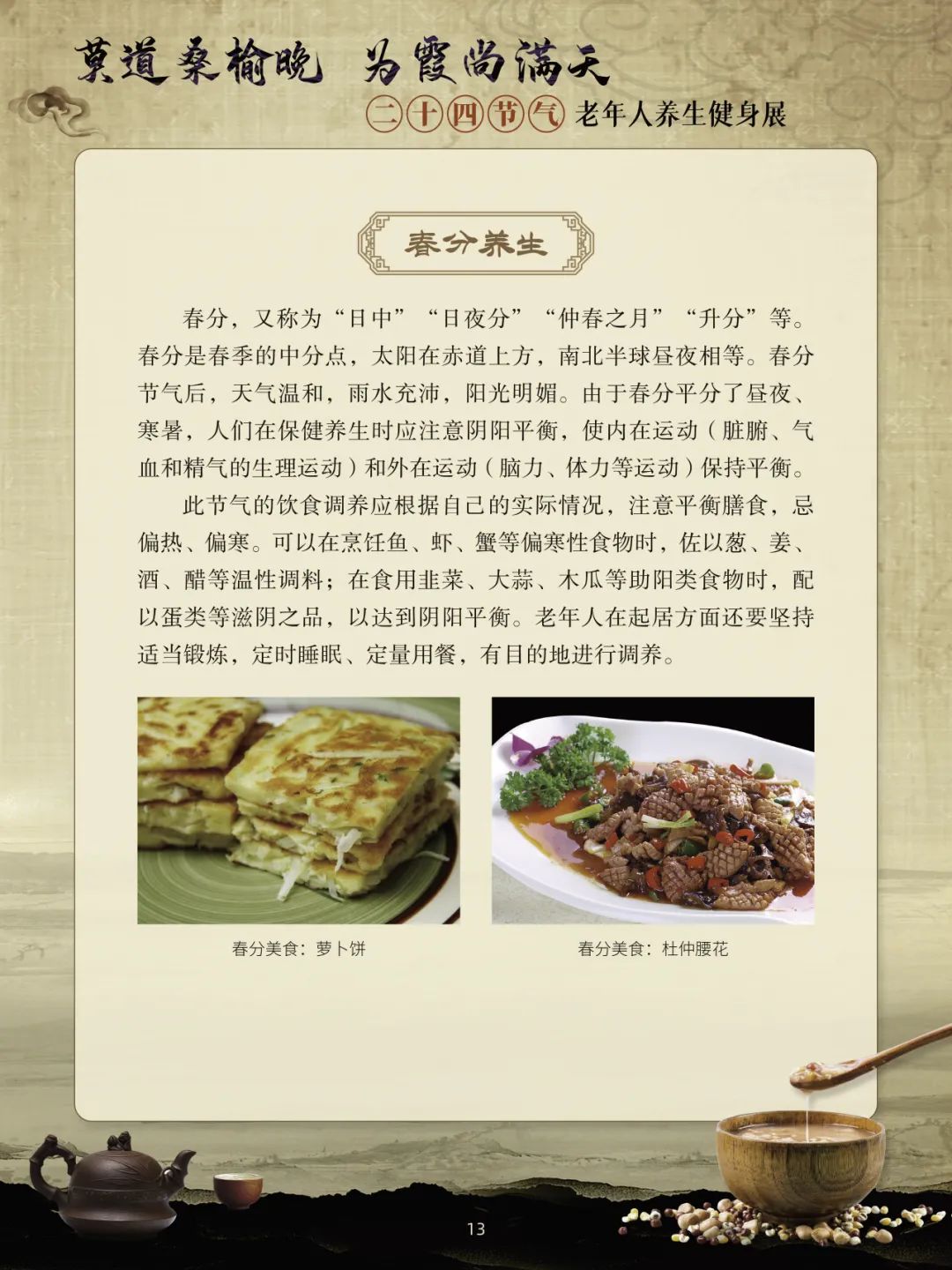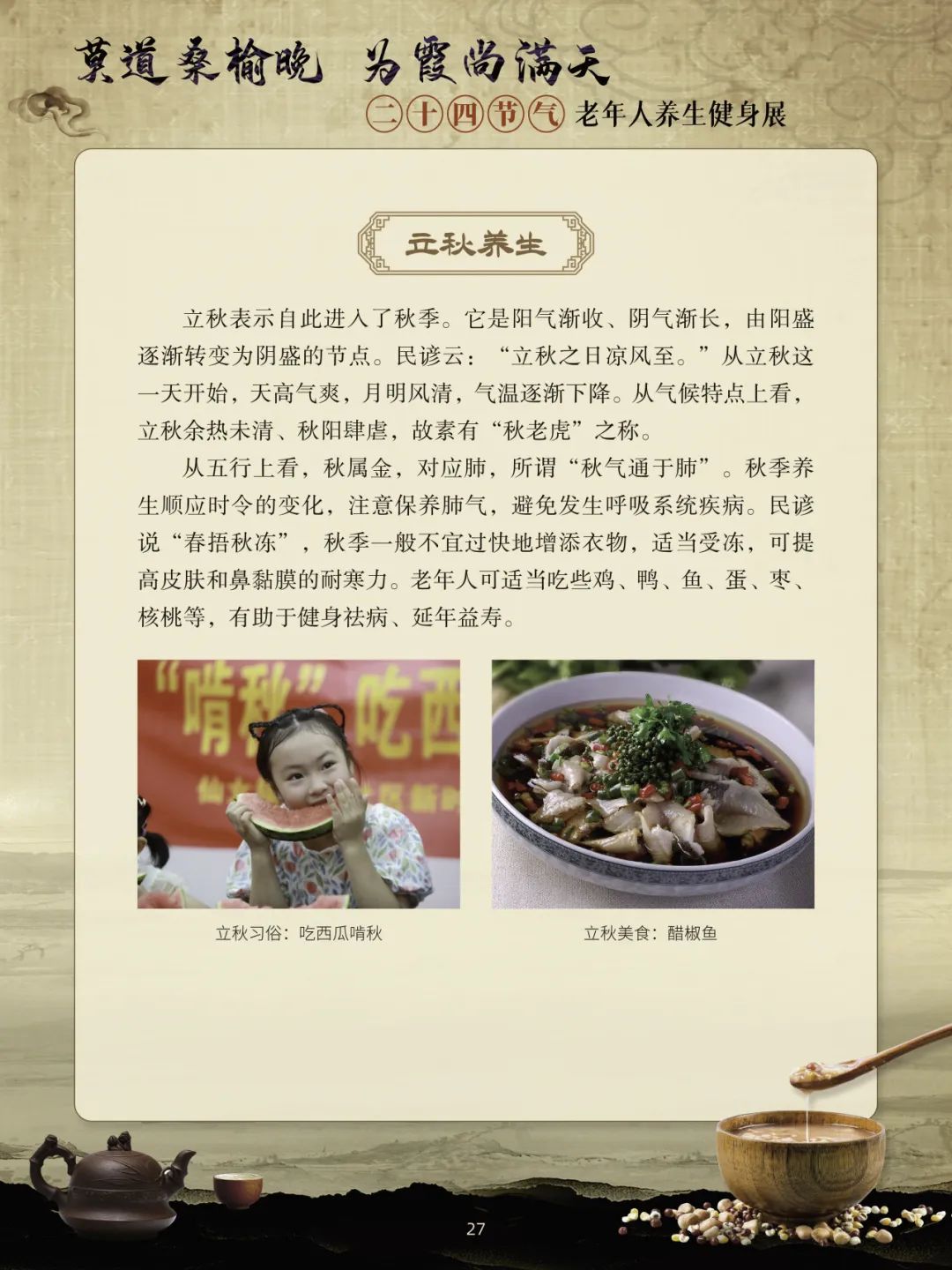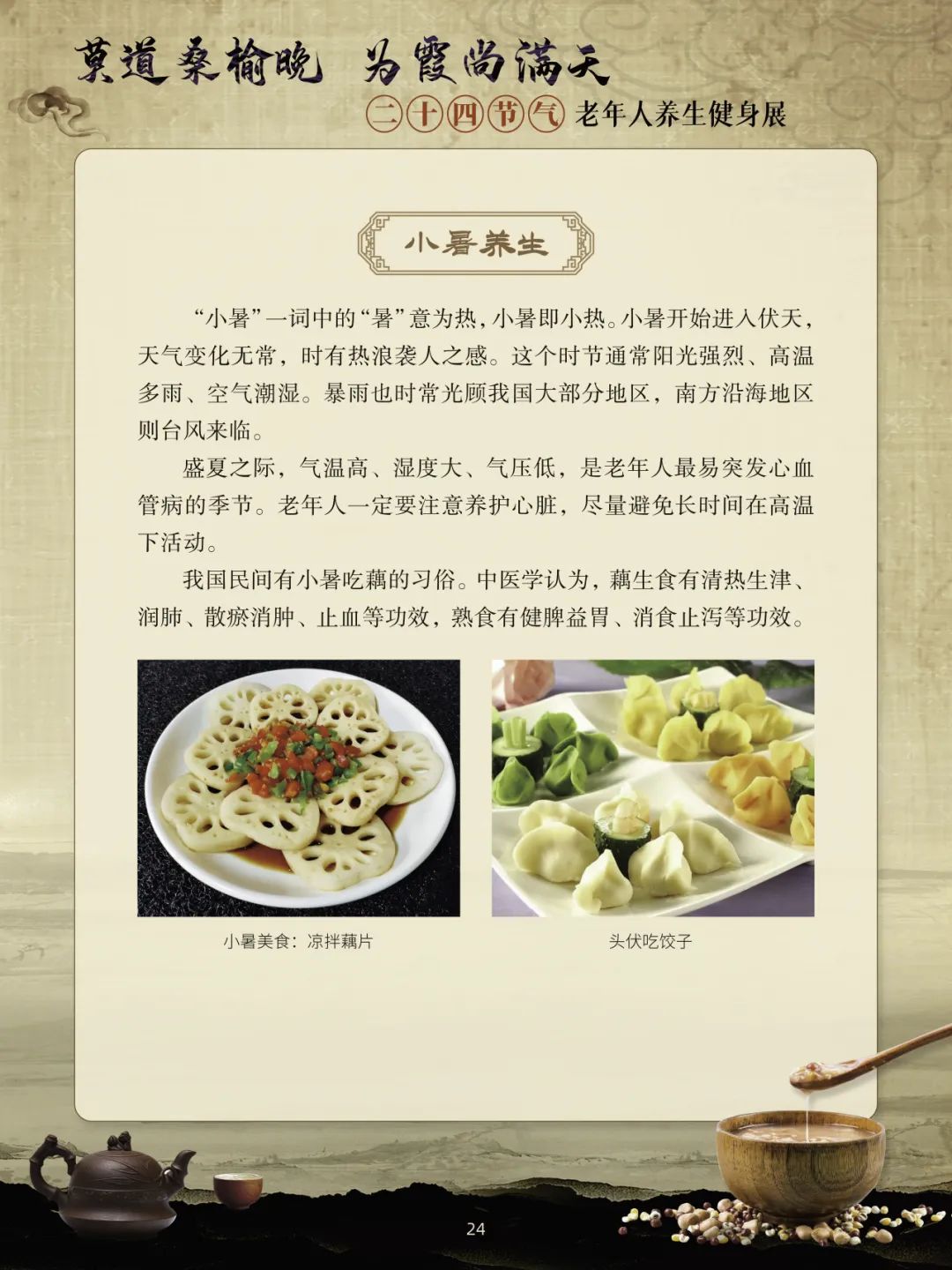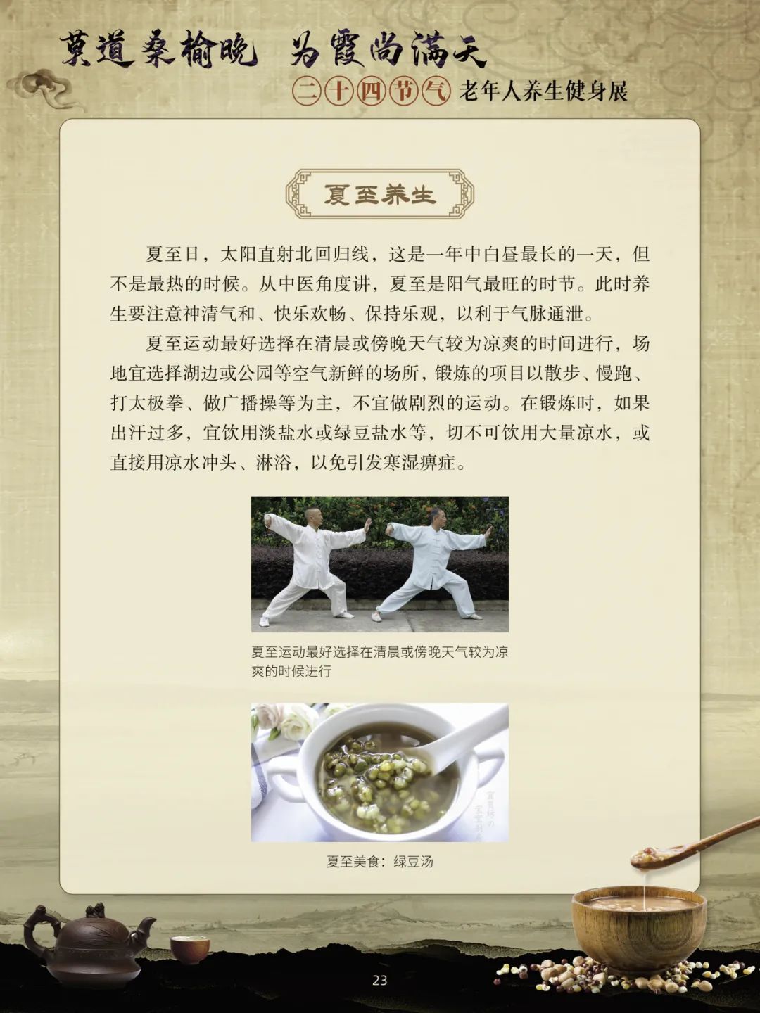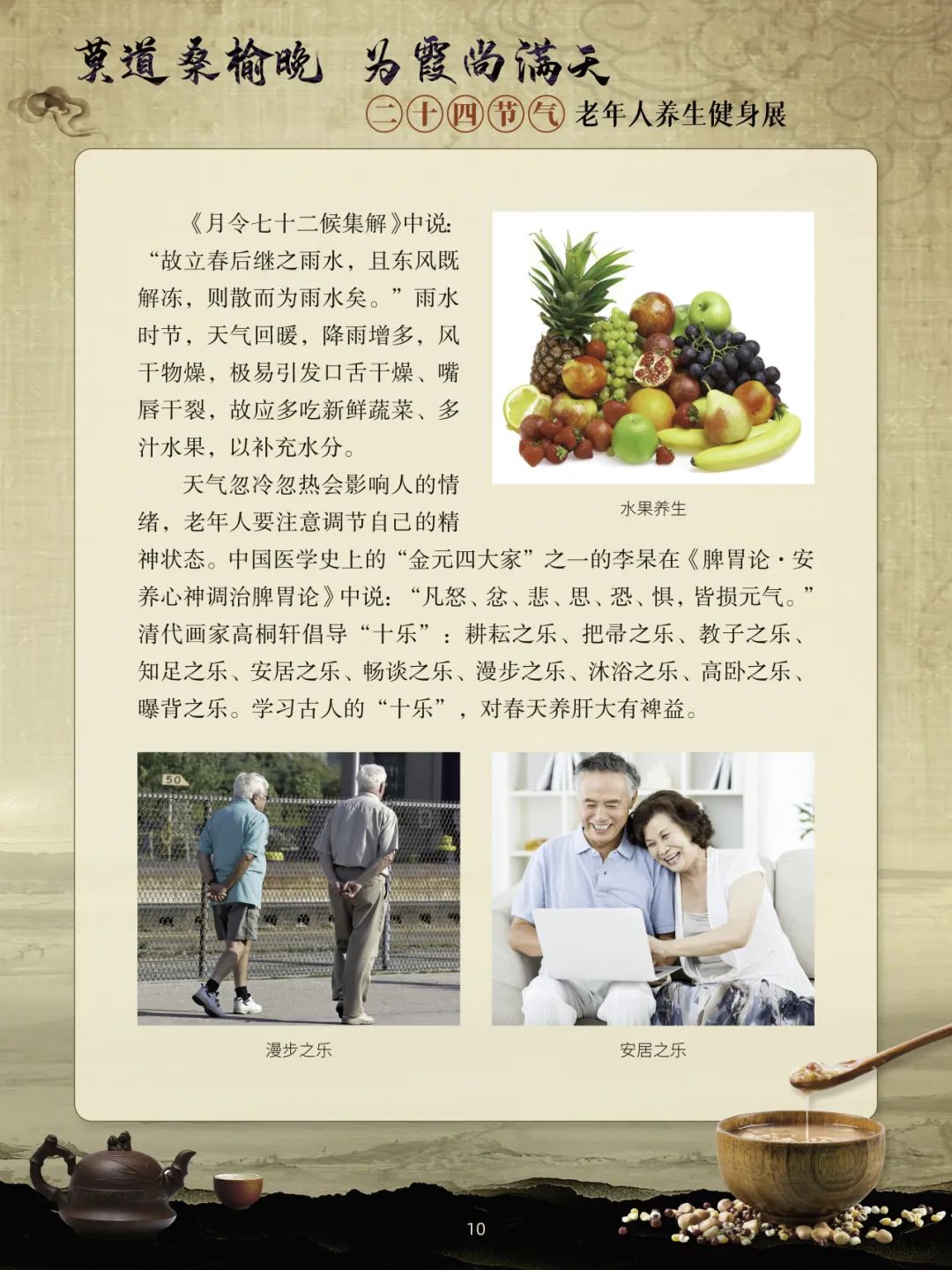 随着社会的发展和科技的进步,人们的生活方式发生了巨大变化,现代的人们似乎不再依自然变换行事,甚至逐渐忽视了节气变化对身体的影响。事实上,如果我们多关注一下节气的变化,跟随其变化调整我们的活动和饮食,很多疾病或身体的不舒服都是可以避免的,特别是老年人在日常保养上更需要对节气变化保持敏感。为此,我们特别策划了本展览。下面就请随着我们的展览,来了解一下老年人应该如何针对二十四节气进行养生与健身活动吧。