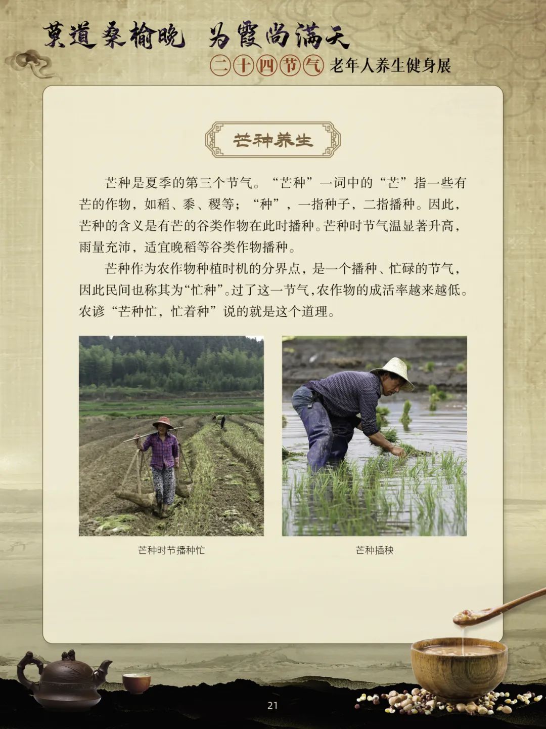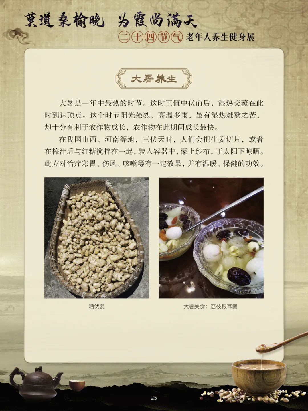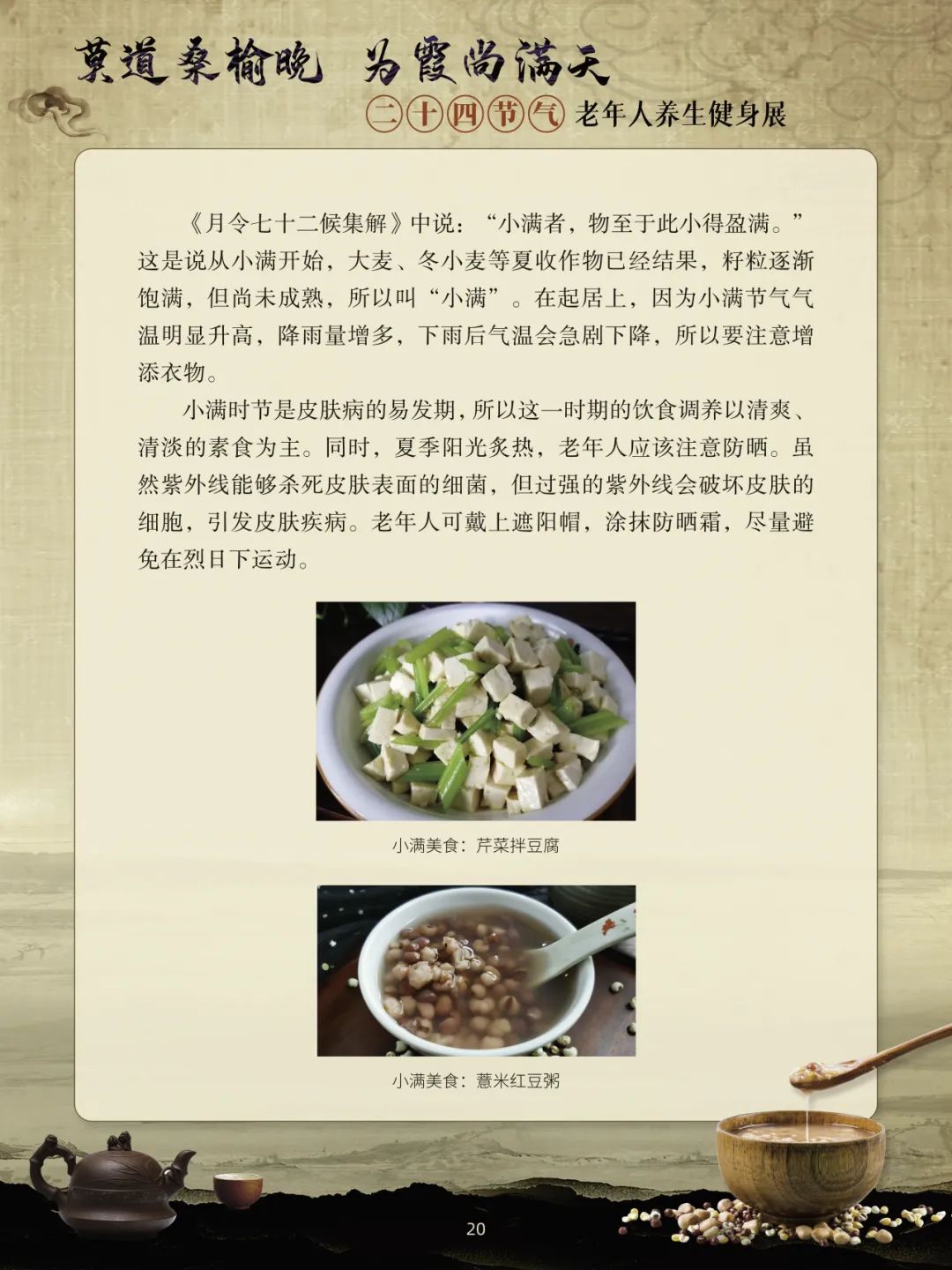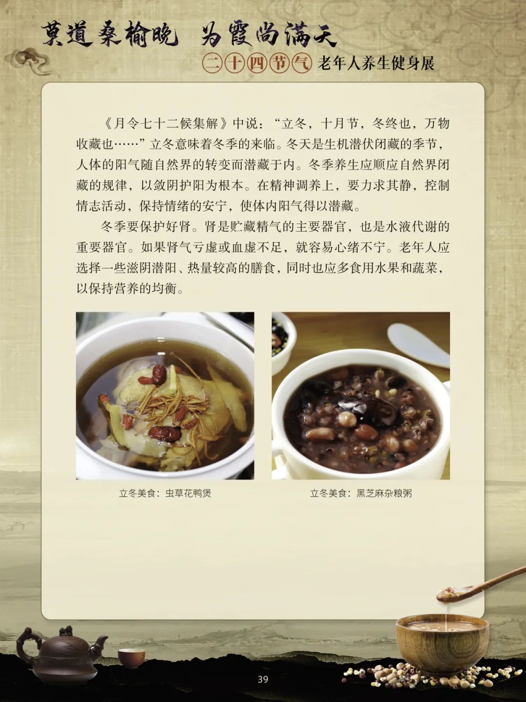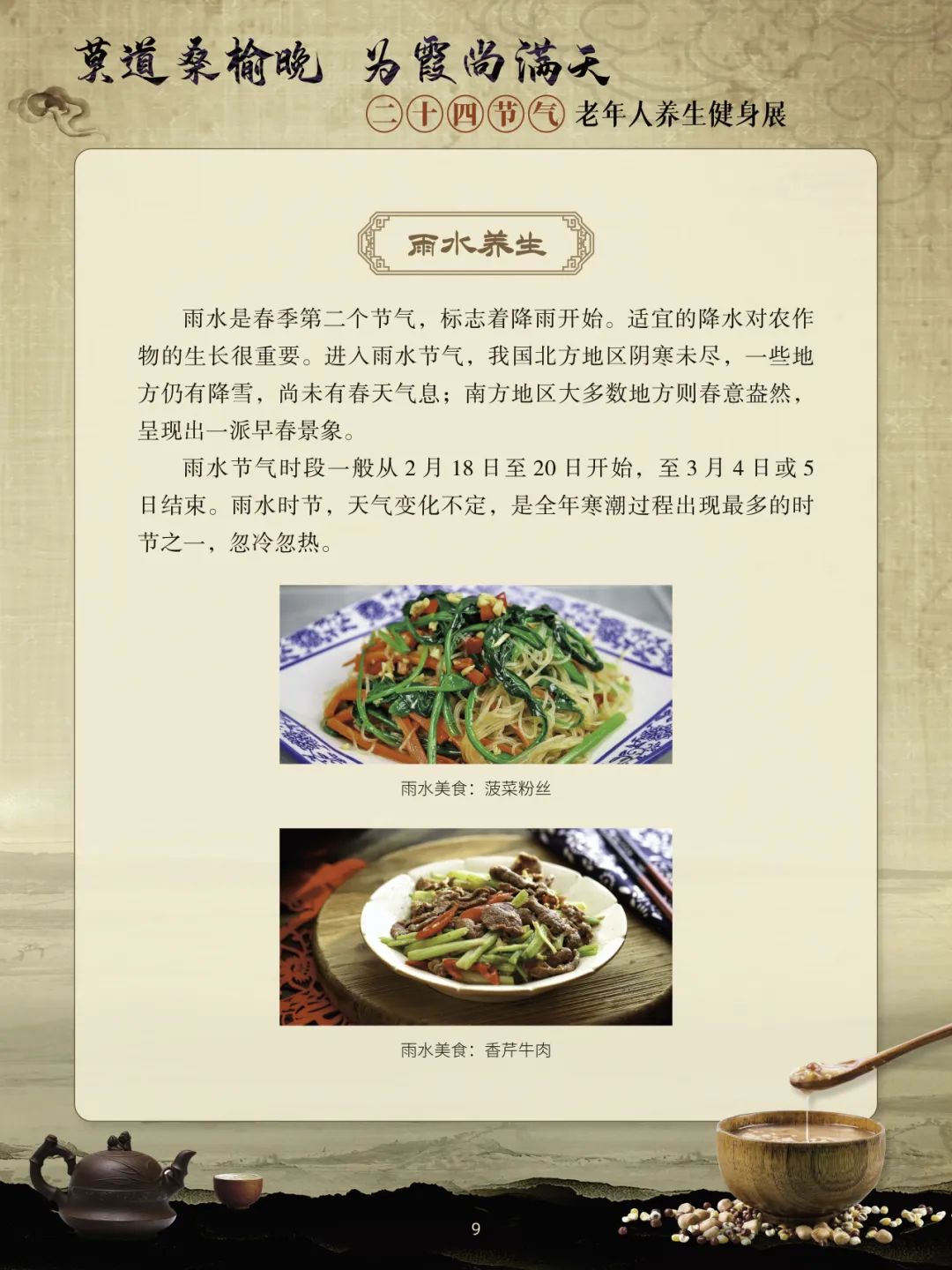 随着社会的发展和科技的进步,人们的生活方式发生了巨大变化,现代的人们似乎不再依自然变换行事,甚至逐渐忽视了节气变化对身体的影响。事实上,如果我们多关注一下节气的变化,跟随其变化调整我们的活动和饮食,很多疾病或身体的不舒服都是可以避免的,特别是老年人在日常保养上更需要对节气变化保持敏感。为此,我们特别策划了本展览。下面就请随着我们的展览,来了解一下老年人应该如何针对二十四节气进行养生与健身活动吧。