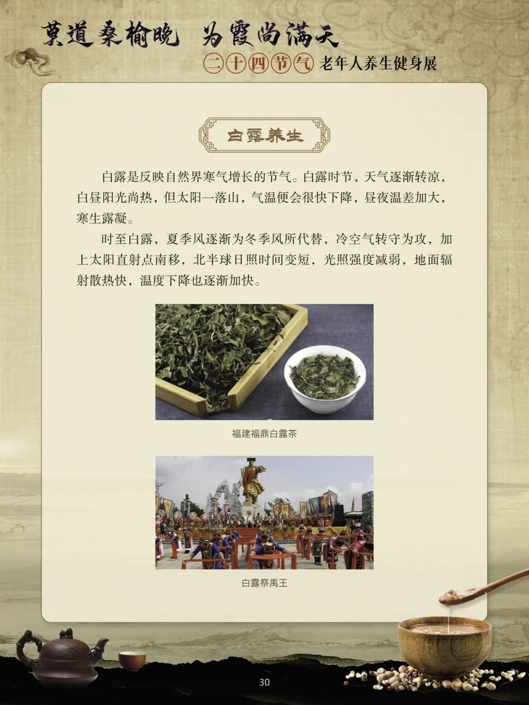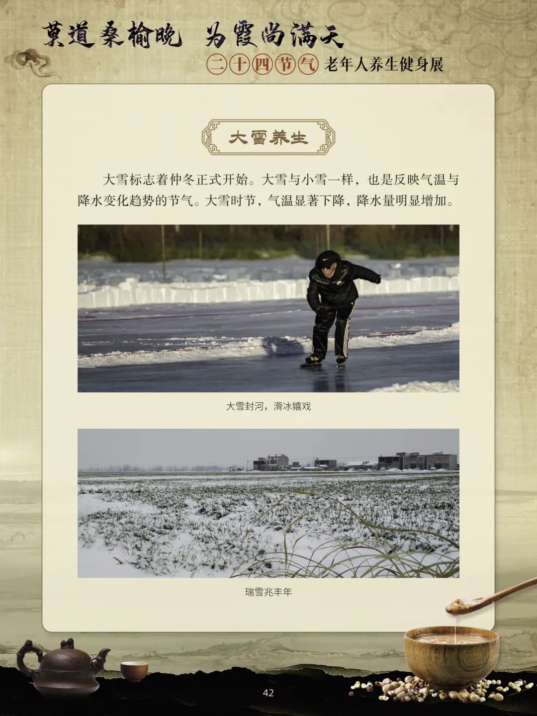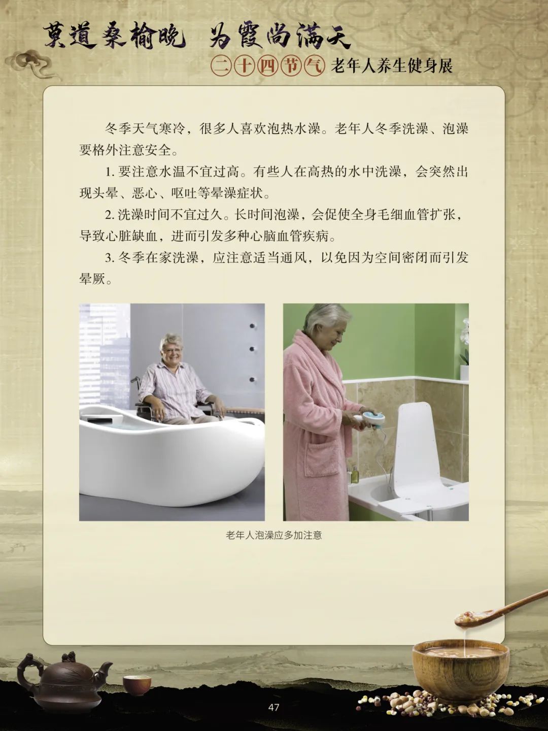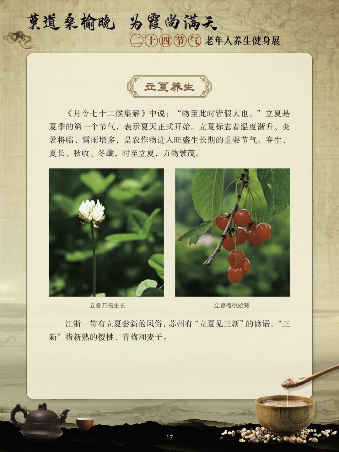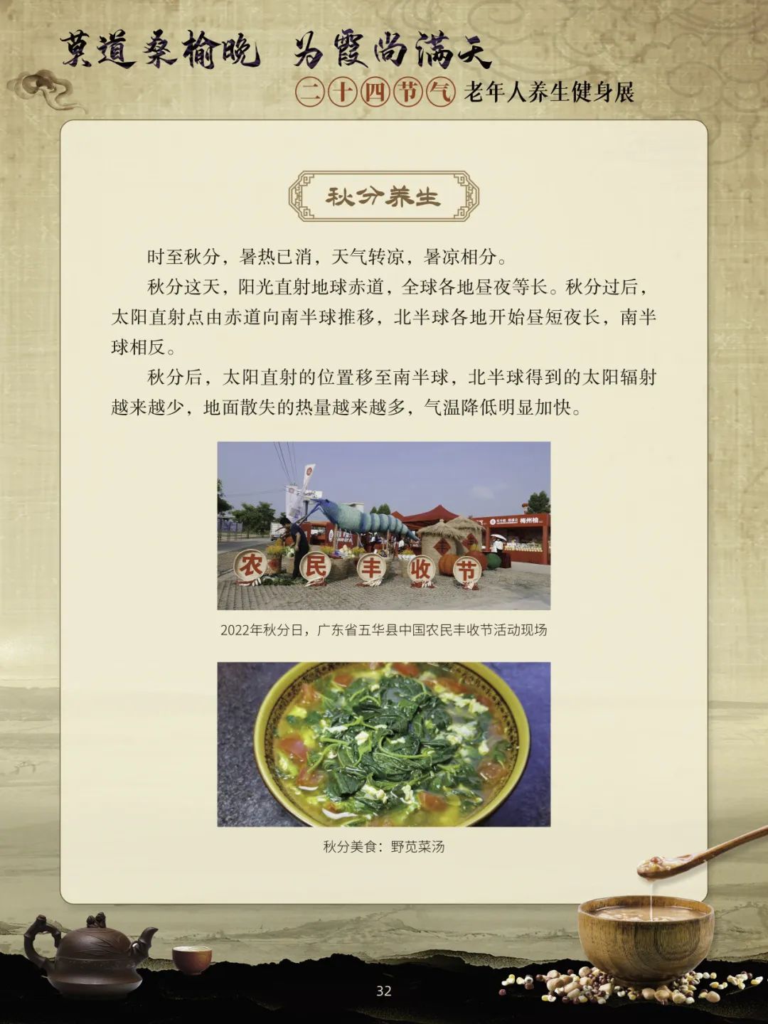 随着社会的发展和科技的进步,人们的生活方式发生了巨大变化,现代的人们似乎不再依自然变换行事,甚至逐渐忽视了节气变化对身体的影响。事实上,如果我们多关注一下节气的变化,跟随其变化调整我们的活动和饮食,很多疾病或身体的不舒服都是可以避免的,特别是老年人在日常保养上更需要对节气变化保持敏感。为此,我们特别策划了本展览。下面就请随着我们的展览,来了解一下老年人应该如何针对二十四节气进行养生与健身活动吧。