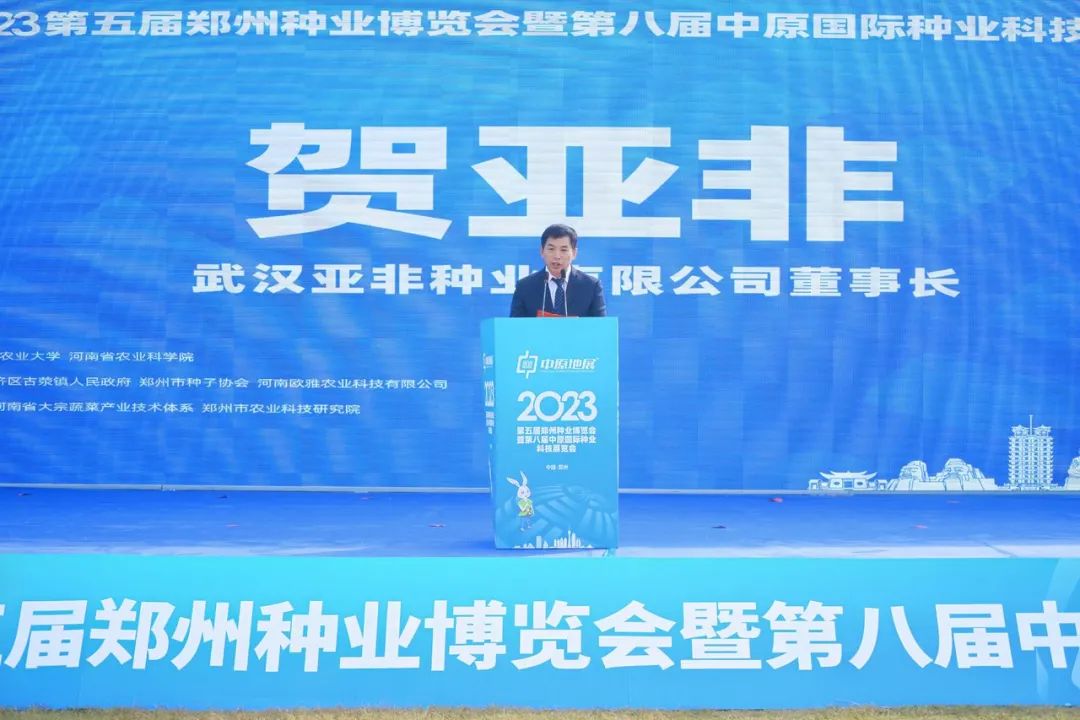 参展单位代表、大会全球战略合作伙伴暨总冠名单位武汉亚非种业有限公司董事长贺亚非致辞