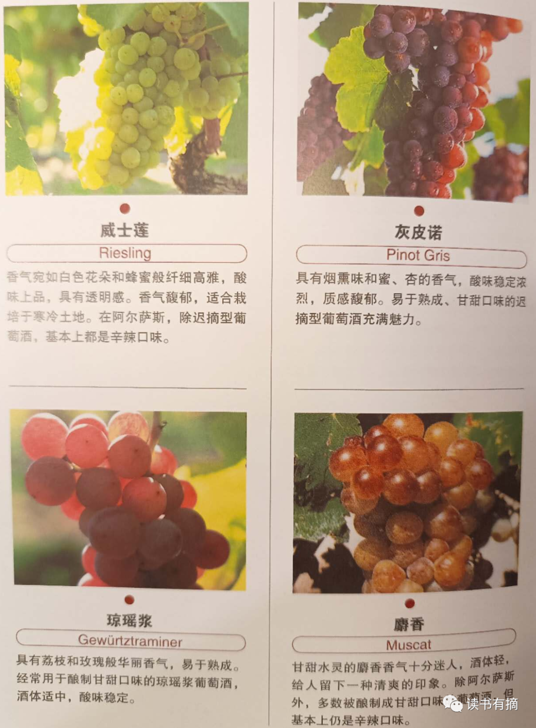 阿拉萨斯(Alsace)位于法国东北部,是条细长的丘陵地带,所产大多是白葡萄酒,单一品种酿造,适合与比较清淡的饮食搭配。葡萄酒瓶上标记品种名称,使用细长的德国笛形酒瓶。 酿造白葡萄酒的品种:威士莲(Riesling)、琼瑶浆(Gewürztraminer)、灰皮诺(Pinot Gris)、麝香(Muscat)是四大高贵品种,图片如下。