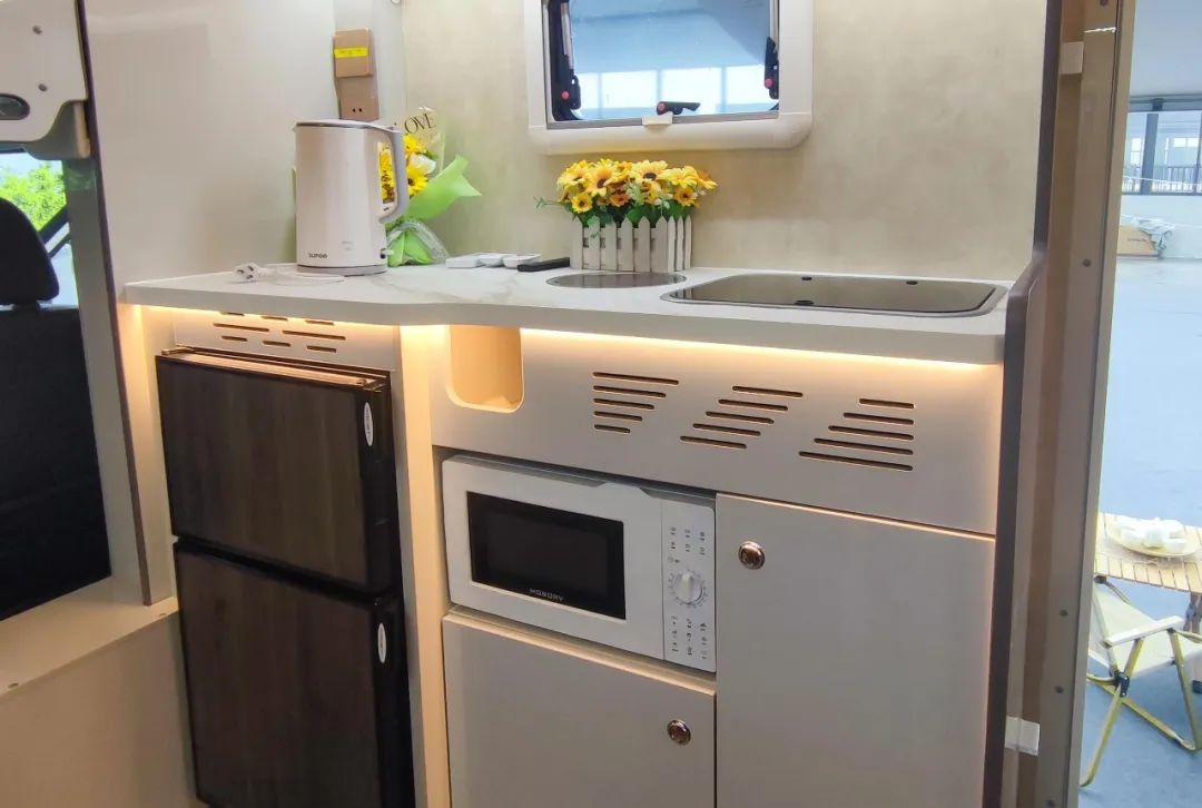 车身右侧是厨房区和储物区,车门左侧一体式橱柜配置有带盖板洗菜池、800W电磁炉、102L双开门冰箱、20L微波炉、储物柜等。另一侧储物区拥有多个储物柜和一个固定台面,方便放置物品。