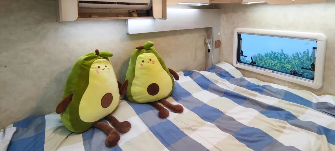 尾部休息区采用横置布局,床铺上方是储物吊柜和1P变频空调,下方则是3kg洗衣机。