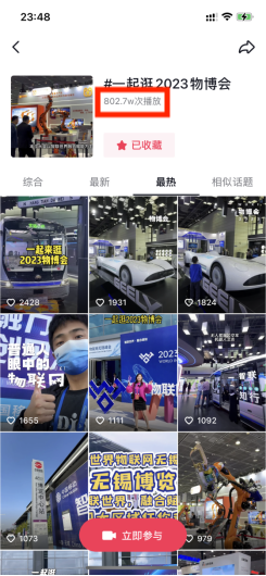 10月20日—23日2023世界物联网博览会在无锡举办。由2023物博会舆论宣传组授权,无锡市委网信办提出“一起逛2023物博会”展会打卡活动策划,组织一批本地自媒体共赴物联网应用与产品展会,借助他们新媒体账号影响力宣传展会盛况。