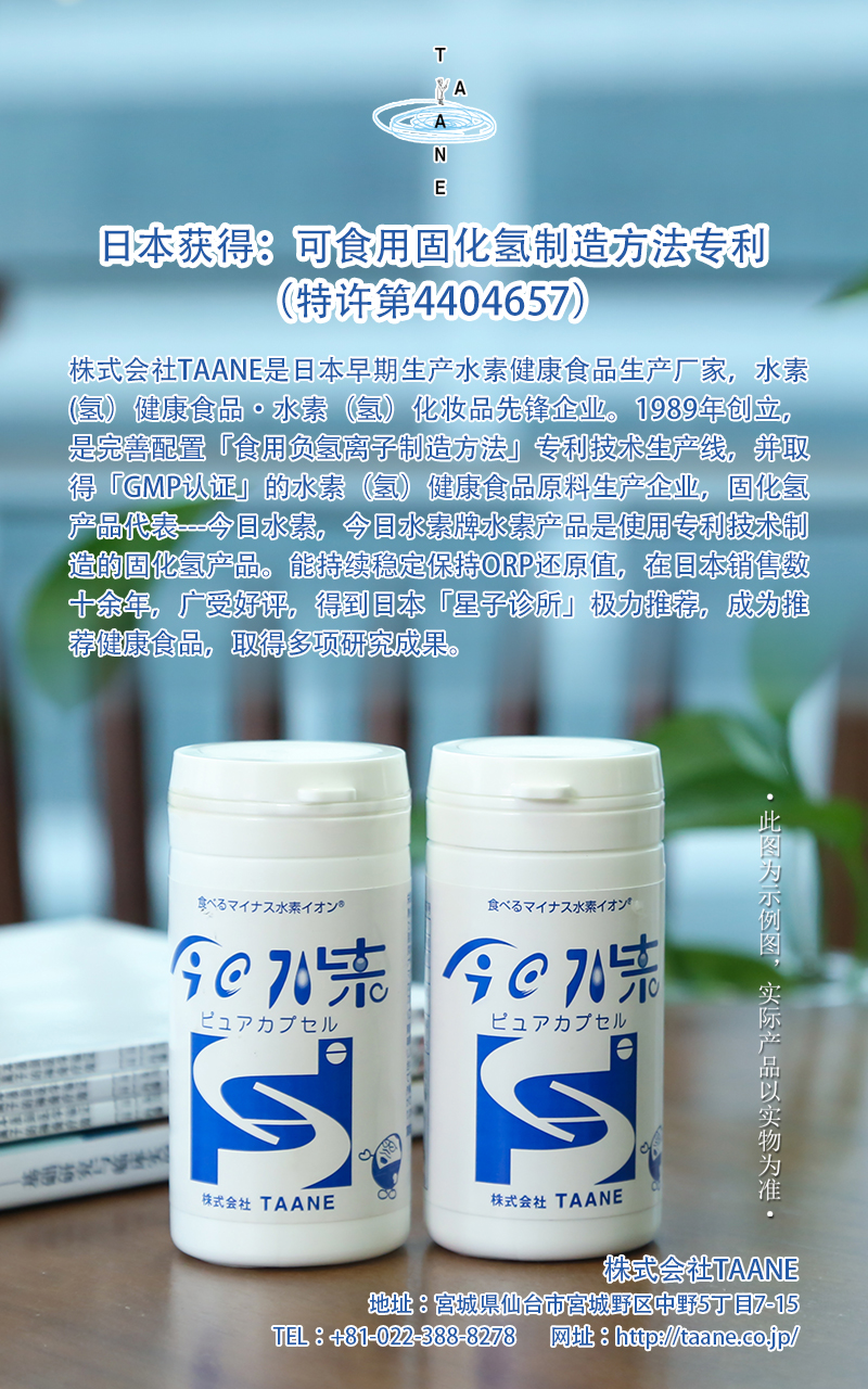 株式会社TAANE在固化氢⻝品领域拥有丰富的经验和专业的技术,主要提供固化氢⻝品原料以及成熟的固化氢产品,其主打品牌“今⽇⽔素”固化氢系列采⽤了 “ 可⻝⽤负氢离⼦的制造⽅法 ”专利 ,已经在市场上销售了10余年,受到了⼴泛的好评。